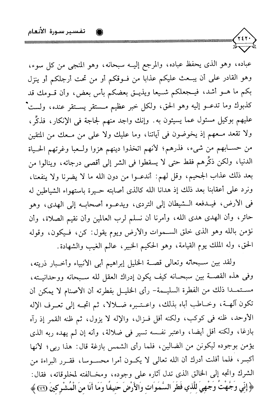 عباده، وهو الذي يحفظ عباده، والمرجع إليه سبحانه، وهو المنجي من كل سوء، وهو القادر على أن يبعث عليكم عذابا من فوقكم أو من تحت أرجلكم أو ينزل بكم ما هو أشد، فيجعلكم شيعا ويذيق بعضكم بأس بعض، وأن قومك قد كذبوك وما تدعو إليه وهو الحق، ولكل خبر عظيم مستقر يستقر عنده، ولست عليهم بوكيل مسئول عما يسيئون به. وإنك واجد منهم لجاجة في الإنكار، فذكِّر، ولا تقعد معهم إذ يخوضون في آياتنا، وما عليك ولا على من معك من المتقين من حسابهم من شيء، فذرهم؛ لأنهم اتخذوا دينهم هزوا ولعبا وغرتهم الحياة الدنيا، ولكن ذكِّرهم فقط حتى لَا يسقطوا في الشر إلى أقصى درجاته، وينالوا من بعد ذلك عذاب الجحيم، وقل لهم: أندعوا من دون الله ما لَا يضرنا ولا ينفعنا، ونرد على أعقابنا بعد ذلك إذ هدانا الله كالذي أصابته حيرة باستهواء الشياطين له في الأرض، فيدفعه الشيطان إلى التردي، ويدعوه أصحابه إلى الهدى، وهو حائر، وأن الهدى هدى الله، وأمرنا أن نسلم لرب العالمين وأن نقيم الصلاة، وأن نؤمن بالله وهو الذي خلق السماوات والأرض ويوم يقول: كن، فيكون، وقوله الحق، وله الملك يوم القيامة، وهو الحكيم الخبير، عالم الغيب والشهادة.