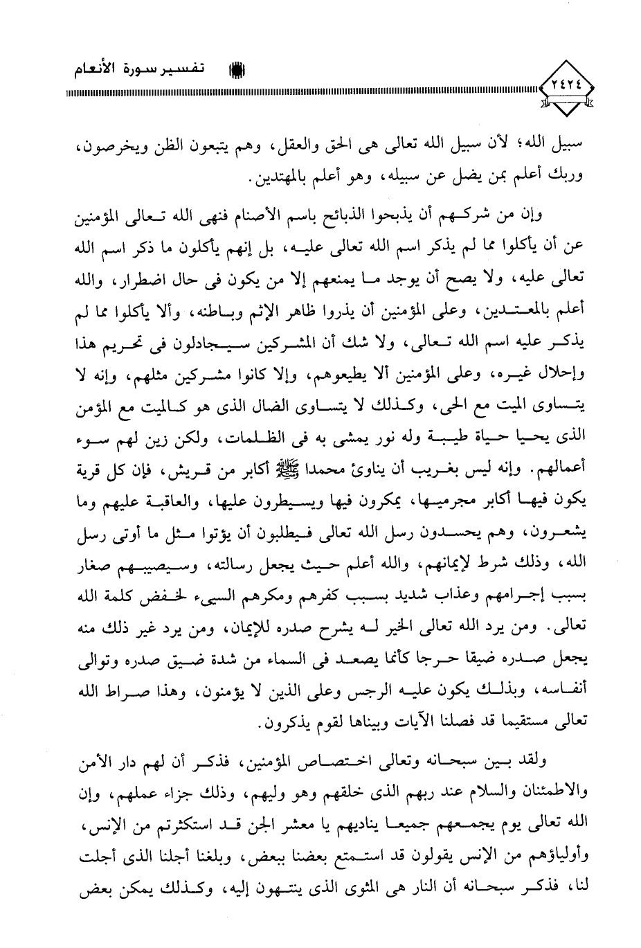 وإن من شركهم أن يذبحوا الذبائح باسم الأصنام فنهى الله تعالى المؤمنين عن أن يأكلوا مما لم يذكر اسم الله تعالى عليه، بل إنهم يأكلون ما ذكر اسم الله تعالى عليه، ولا يصح أن يوجد ما يمنعهم إلا من يكون في حال اضطرار، والله أعلم بالمعتدين، وعلى المؤمنين أن يذروا ظاهر الإثم وباطنه، وألا يأكلوا مما لم يذكر عليه اسم الله تعالى، ولا شك أن المشركين سيجادلون في تحريم هذا وإحلال غيره، وعلى المؤمنين ألا يطيعوهم، وإلا كانوا مشركين مثلهم، وإنه لا يتساوى الميت مع الحي، وكذلك لَا يتساوى الضال الذي هو كالميت مع المؤمن الذي يحيا حياة طيبة وله نور يمشي به في الظلمات، ولكن زين لهم سوء أعمالهم. وإنه ليس بغريب أن يناوئ محمدًا - صلى الله عليه وسلم - أكابر من قريش، فإن كل قرية يكون فيها أكابر مجرميها، يمكرون فيها ويسيطرون عليها، والعاقبة عليهم وما يشعرون، وهم يحسدون رسل الله تعالى فيطلبون أن يؤتوا مثل ما أوتي رسل الله، وذلك شرط لإيمانهم، والله أعلم حيث يجعل رسالته، وسيصيبهم صغار بسبب إجرامهم وعذاب شديد بسبب كفرهم ومكرهم السيئ لخفض كلمة الله تعالى. ومن يرد الله تعالى الخير له يشرح صدره للإيمان، ومن يرد غير ذلك منه يجعل صدره ضيقا حرجا كأنما يصعد في السماء من شدة ضيق صدره وتوالي أنفاسه، وبذلك يكون عليه الرجس وعلى الذين لَا يؤمنون، وهذا صراط الله تعالى مستقيما قد فصلنا الآيات وبينَّاها لقوم يذكرون.