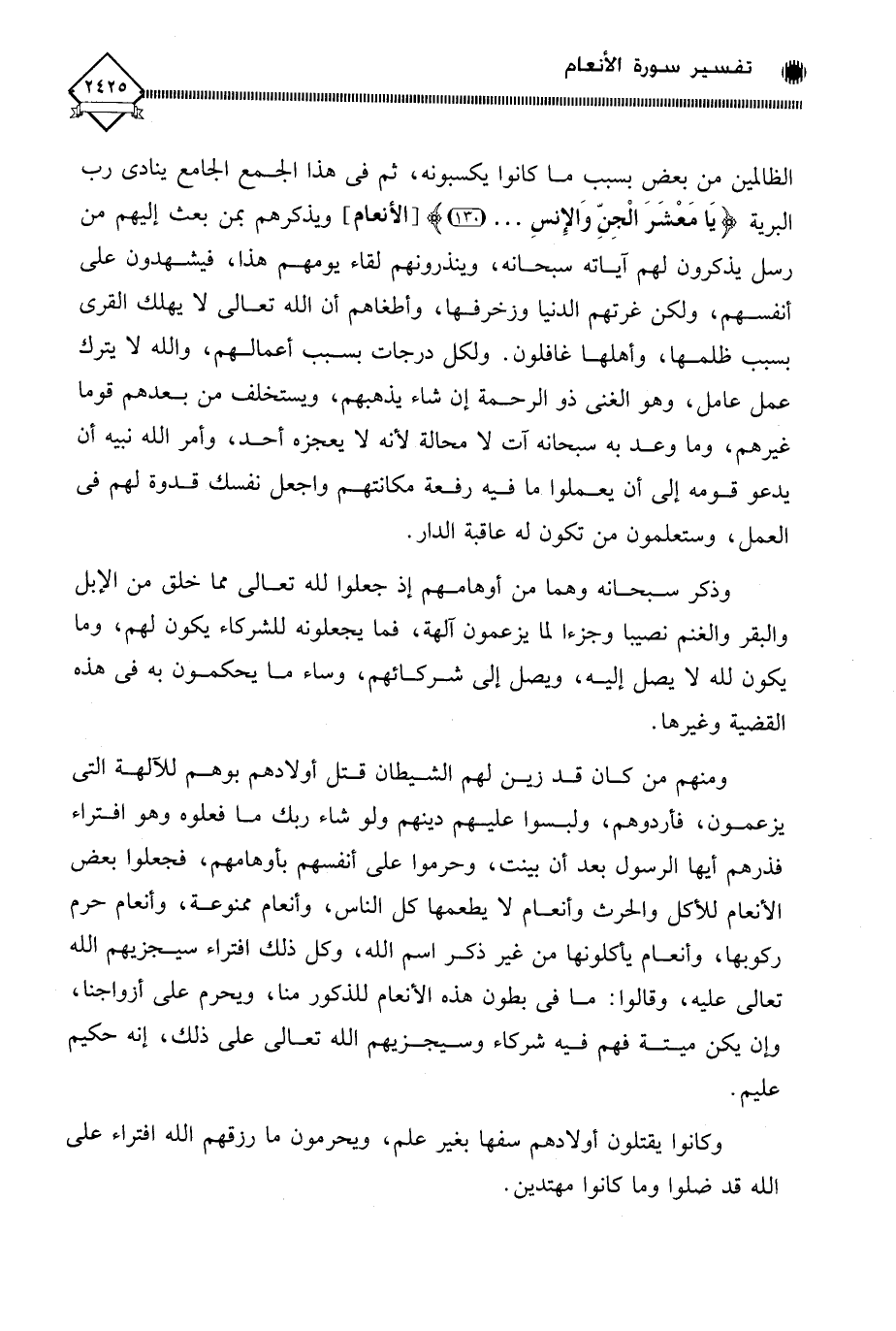 ومنهم من كان قد زين لهم الشيطان قتل أولادهم بوهم للآلهة التي يزعمون، فأردوهم، ولبسوا عليهم دينهم ولو شاء ربك ما فعلوه وهو افتراء فذرهم أيها الرسول - صلى الله عليه وسلم - بعد أن بينت، وحرموا على أنفسهم بأوهامهم، فجعلوا بعض الأنعام للأكل والحرث وأنعام لَا يطعمها كل الناس، وأنعام ممنوعة، وأنعام حرم ركوبها، وأنعام يأكلونها من غير ذكر اسم الله، وكل ذلك افتراء سيجزيهم الله تعالى عليه، وقالوا: ما في بطون هذه الأنعام للذكور منا، ويحرم على أزواجنا، وإن يكن ميتة فهم فيه شركاء وسيجزيهم الله تعالى على ذلك، إنه حكيم عليم.