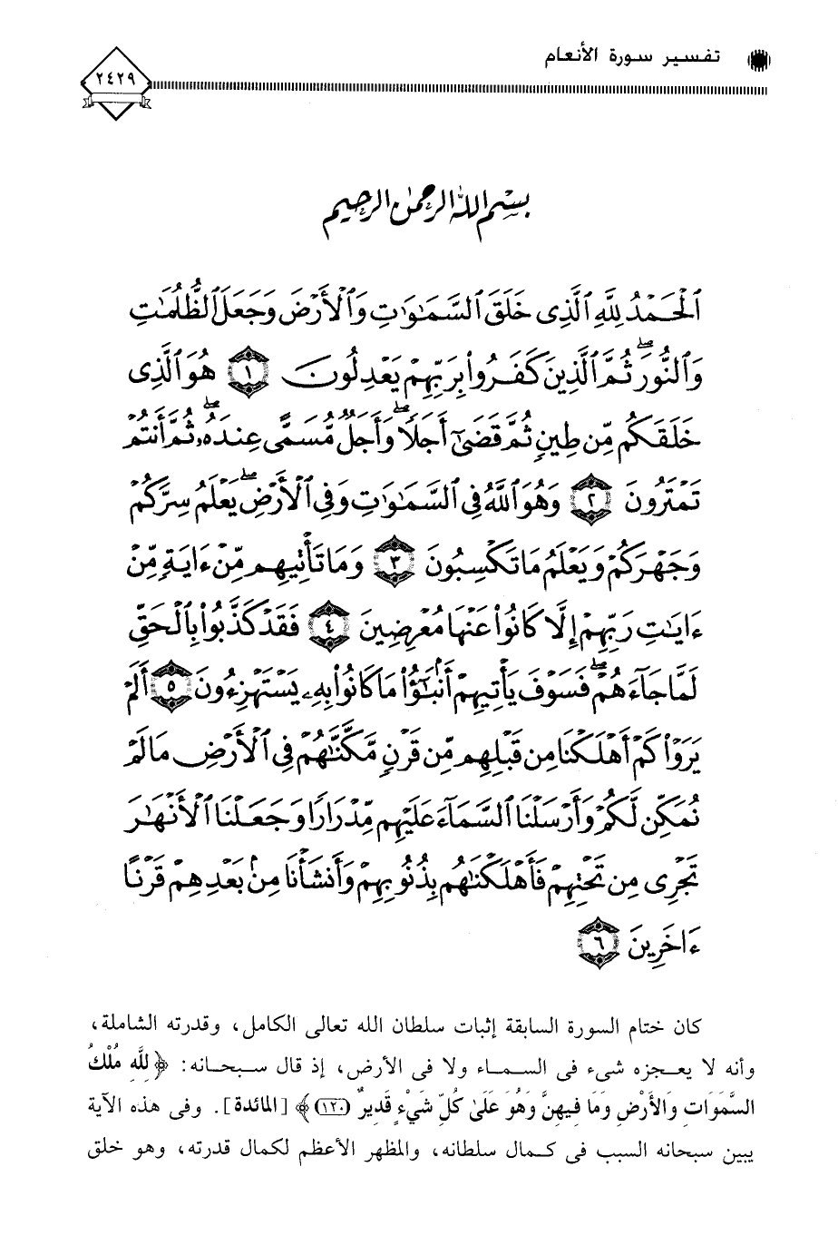 (الْحَمْدُ لِلَّهِ الَّذِي خَلَقَ السَّمَاوَاتِ وَالْأَرْضَ وَجَعَلَ الظُّلُمَاتِ وَالنُّورَ ثُمَّ الَّذِينَ كَفَرُوا بِرَبِّهِمْ يَعْدِلُونَ (1) هُوَ الَّذِي خَلَقَكُمْ مِنْ طِينٍ ثُمَّ قَضَى أَجَلًا وَأَجَلٌ مُسَمًّى عِنْدَهُ ثُمَّ أَنْتُمْ تَمْتَرُونَ (2) وَهُوَ اللَّهُ فِي السَّمَاوَاتِ وَفِي الْأَرْضِ يَعْلَمُ سِرَّكُمْ وَجَهْرَكُمْ وَيَعْلَمُ مَا تَكْسِبُونَ (3) وَمَا تَأْتِيهِمْ مِنْ آيَةٍ مِنْ آيَاتِ رَبِّهِمْ إِلَّا كَانُوا عَنْهَا مُعْرِضِينَ (4) فَقَدْ كَذَّبُوا بِالْحَقِّ لَمَّا جَاءَهُمْ فَسَوْفَ يَأْتِيهِمْ أَنْبَاءُ مَا كَانُوا بِهِ يَسْتَهْزِءُونَ (5) أَلَمْ يَرَوْا كَمْ أَهْلَكْنَا مِنْ قَبْلِهِمْ مِنْ قَرْنٍ مَكَّنَّاهُمْ فِي الْأَرْضِ مَا لَمْ نُمَكِّنْ لَكُمْ وَأَرْسَلْنَا السَّمَاءَ عَلَيْهِمْ مِدْرَارًا وَجَعَلْنَا الْأَنْهَارَ تَجْرِي مِنْ تَحْتِهِمْ فَأَهْلَكْنَاهُمْ بِذُنُوبِهِمْ وَأَنْشَأْنَا مِنْ بَعْدِهِمْ قَرْنًا آخَرِينَ (6)