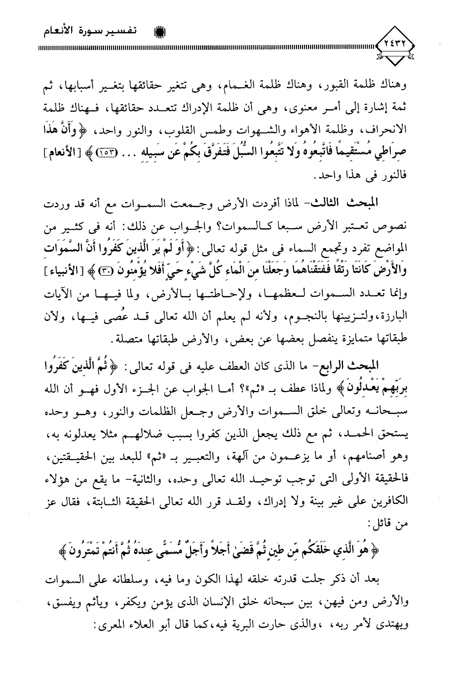 المبحث الرابع - ما الذي كان العطف عليه في قوله تعالى: (ثُمَّ الَّذِينَ كَفَرُوا بِرَبِّهِمْ يَعْدِلُونَ) ولماذا عطف بـ " ثم "؟ أما الجواب عن الجزء الأول فهو أن الله سبحانه وتعالى خلق السماوات والأرض وجعل الظلمات والنور، وهو وحده يستحق الحمد، ثم مع ذلك يجعل الذين كفروا بسبب ضلالهم مثلا يعدلونه به، وهو أصنامهم، أو ما يزعمون من آلهة، والتعبير بـ " ثم " للبعد بين الحقيقتين، فالحقيقة الأولى التي توجب توحيد الله تعالى وحده، والثانية - ما يقع من هؤلاء الكافرين على غير بينة ولا إدراك، ولقد قرر الله تعالى الحقيقة الثابتة، فقال عز من قائل:
