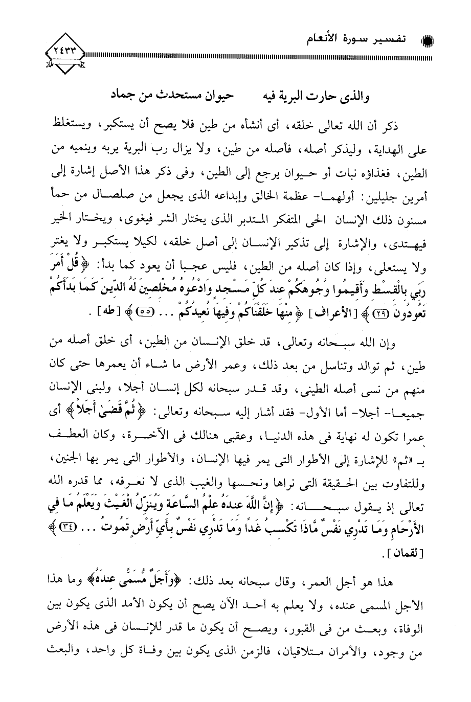 وإن الله سبحانه وتعالى، قد خلق الإنسان من الطين، أي خلق أصله من طين، ثم توالد وتناسل من بعد ذلك، وعمر الأرض ما شاء أن يعمرها حتى كان منهم من نسي أصله الطيني، وقد قدر سبحانه لكل إنسان أجلا، ولبني الإنسان جميعا - أجلا - أما الأول - فقد أشار إليه سبحانه وتعالى: (ثُمَّ قَضَى أَجَلًا) أي عمرا تكون له نهاية في هذه الدنيا، وعقبى هنالك في الآخرة، وكان العطف بـ " ثم " للإشارة إلى الأطوار التي يمر فيها الإنسان، والأطوار التي يمر بها الجنين، وللتفاوت بين الحقيقة التي نراها ونحسها والغيب الذي لَا نعرفه، مما قدره الله تعالى إذ يقول سبحانه: (إِنَّ اللَّهَ عِنْدَهُ عِلْمُ السَّاعَةِ وَيُنَزِّلُ الْغَيْثَ وَيَعْلَمُ مَا فِي الْأَرْحَامِ وَمَا تَدْرِي نَفْسٌ مَاذَا تَكْسِبُ غَدًا وَمَا تَدْرِي نَفْسٌ بِأَيِّ أَرْضٍ تَمُوتُ. . .).