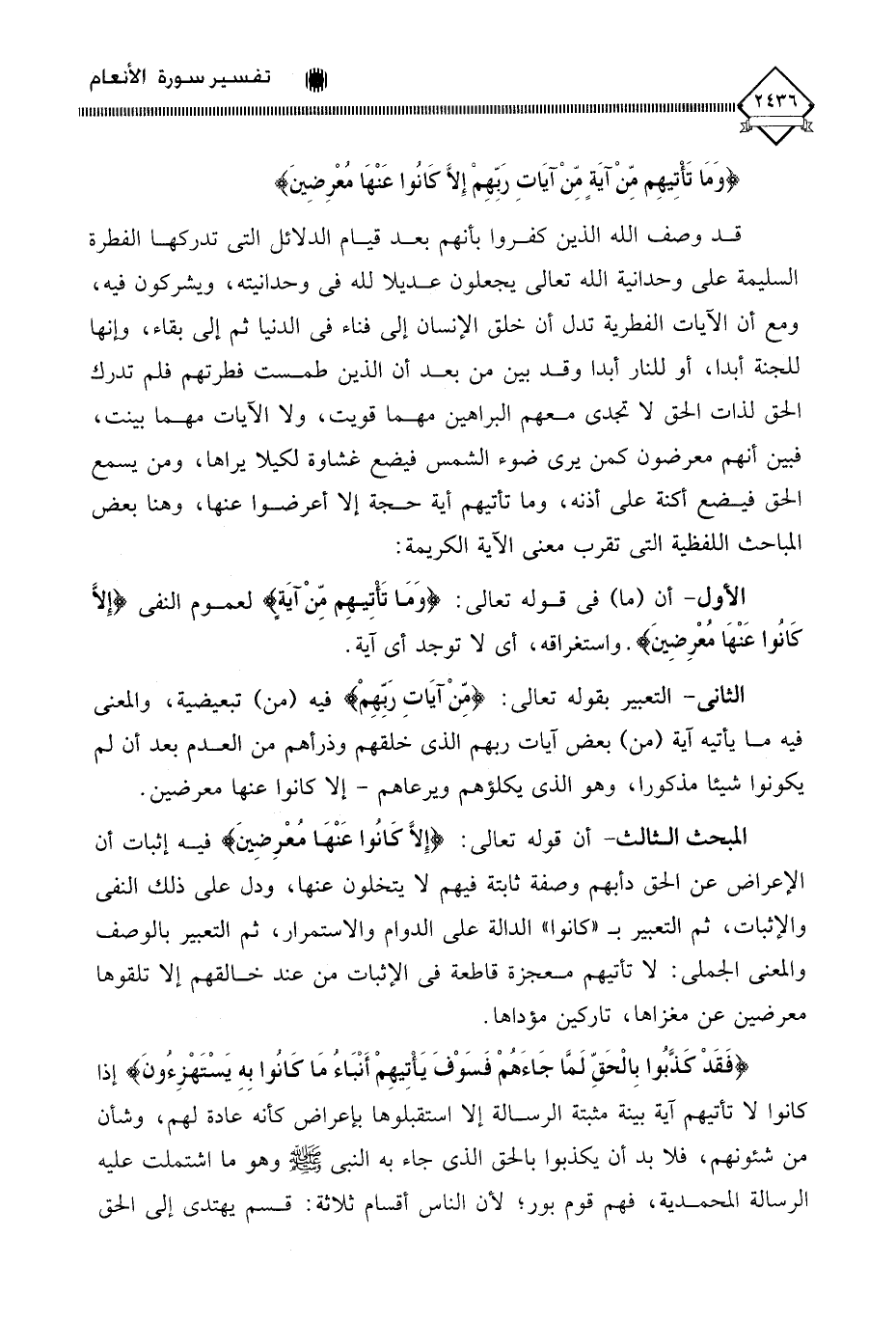 المبحث الثالث - أن قوله تعالى: (إِلَّا كانُوا عَنْهَا مُعْرِضينَ) فيه إثبات أن الإعراض عن الحق دأبهم وصفة ثابتة فيهم لَا يتخلون عنها، ودل على ذلك النفي والإثبات، ثم التعبير بـ " كانوا " الدالة على الدوام والاستمرار، ثم التعبير بالوصف والمعنى الجملي: لَا تأتيهم معجزة قاطعة في الإثبات من عند خالقهم إلا تلقوها معرضين عن مغزاها، تاركين مؤداها.