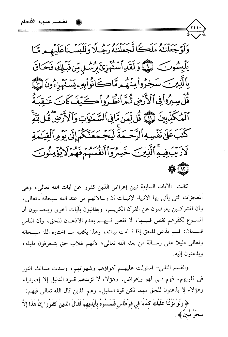 وَلَوْ جَعَلْنَاهُ مَلَكًا لَجَعَلْنَاهُ رَجُلًا وَلَلَبَسْنَا عَلَيْهِمْ مَا يَلْبِسُونَ (9) وَلَقَدِ اسْتُهْزِئَ بِرُسُلٍ مِنْ قَبْلِكَ فَحَاقَ بِالَّذِينَ سَخِرُوا مِنْهُمْ مَا كَانُوا بِهِ يَسْتَهْزِءُونَ (10) قُلْ سِيرُوا فِي الْأَرْضِ ثُمَّ انْظُرُوا كَيْفَ كَانَ عَاقِبَةُ الْمُكَذِّبِينَ (11) قُلْ لِمَنْ مَا فِي السَّمَاوَاتِ وَالْأَرْضِ قُلْ لِلَّهِ كَتَبَ عَلَى نَفْسِهِ الرَّحْمَةَ لَيَجْمَعَنَّكُمْ إِلَى يَوْمِ الْقِيَامَةِ لَا رَيْبَ فِيهِ الَّذِينَ خَسِرُوا أَنْفُسَهُمْ فَهُمْ لَا يُؤْمِنُونَ (12)