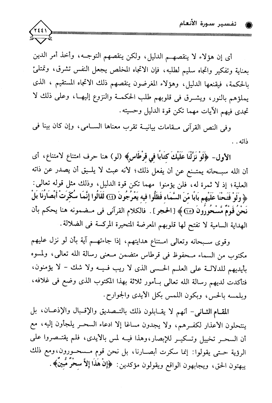الأول - (لَوْ نَزَّلْنَا عَلَيْكَ كِتَابًا فِي قِرْطَاس) (لو) هنا حرف امتناع لامتناع، أي أن الله سبحانه يمتنع عن أن يفعل ذلك، لأنه عبث لَا يليق أن يصدر عن ذاته العلية، إذ لَا ثمرة له، فلن يؤمنوا مهما تكن قوة الدليل، وذلك مثل قوله تعالى: (وَلَوْ فَتَحْنَا عَلَيْهِمْ بَابًا مِنَ السَّمَاءِ فَظَلُّوا فِيهِ يَعْرُجُونَ (14) لَقَالُوا إِنَّمَا سُكِّرَتْ أَبْصَارُنَا بَلْ نَحْنُ قَوْمٌ مَسْحُورُونَ (15).