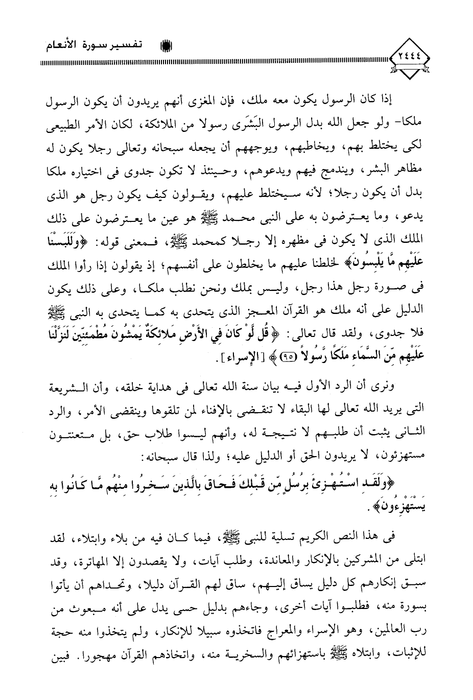 إذا كان الرسول يكون معه ملك، فإن المغزى أنهم يريدون أن يكون الرسول ملكا - ولو جعل الله بدلى الرسول البَشَري رسولا من الملائكة، لكان الأمر الطبيعي لكي يختلط بهم، ويخاطبهم، ويوجههم أن يجعله سبحانه وتعالى رجلا يكون له مظاهر البشر، ويندمج فيهم ويدعوهم، وحينئذ لَا تكون جدوى في اختياره ملكا بدل أن يكون رجلا؛ لأنه سيختلط عليهم، ويقولون كيف يكون رجل هو الذي يدعو، وما يعترضون به على النبي محمد - صلى الله عليه وسلم - هو عين ما يعترضون على ذلك الملك الذي لَا يكون في مظهره إلا رجلا كمحمد - صلى الله عليه وسلم -، فمعنى قوله: (وَلَلَبَسْنَا عَلَيْهِم مَا يَلْبِسُونَ) لخلطنا عليهم ما يخلطون على أنفسهم، إذ يقولون إذا رأوا الملك في صورة رجل هذا رجل، وليس بملك ونحن نطلب ملكا، وعلى ذلك يكون الدليل على أنه ملك هو القرآن المعجز الذي يتحدى به كما يتحدى به النبي - صلى الله عليه وسلم - فلا جدوى، ولقد قال تعالى: (قُل لَوْ كَانَ فِي الأَرْضِ مَلائِكَةٌ يَمْشُونَ مُطْمَئِنِّينَ لَنَزَّلْنَا عَلَيْهِم مِّنَ السَّمَاءِ مَلَكًا رَّسُولًا).