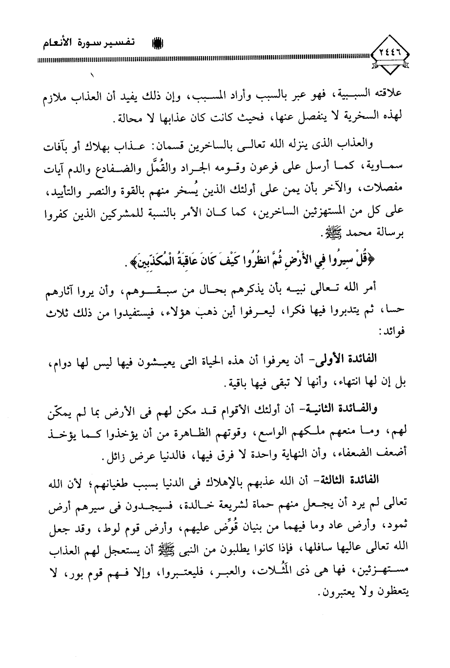 الفائدة الثالثة - أن الله عذبهم بالإهلاك في الدنيا بسبب طغيانهم؛ لأن الله تعالى لم يرد أن يجعل منهم حماة لشريعة خالدة، فسيجدون في سيرهم أرض ثمود، وأرض عاد وما فيهما من بنيان قُوِّض عليهم، وأرض قوم لوط، وقد جعل الله تعالى عاليها سافلها، فإذا كانوا يطلبون من النبي - صلى الله عليه وسلم - أن يستعجل لهم العذاب مستهزئين، فها هي ذي المَثُلات، والعبر، فليعتبروا، وإلا فهم قوم بور، لا يتعظون ولا يعتبرون.