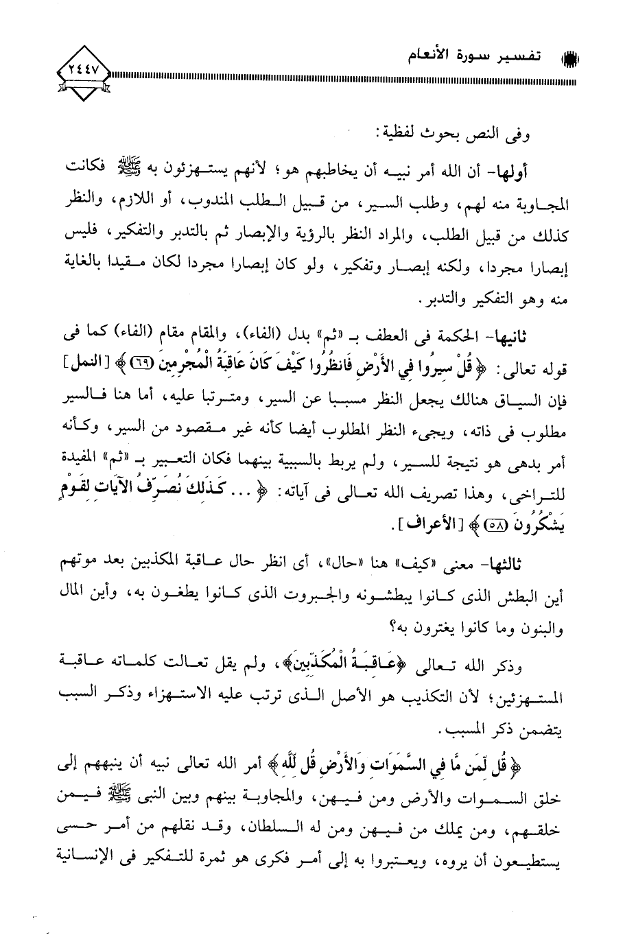 ثانيها - الحكمة في العطف بـ " ثم " بدل (الفاء)، والمقام مقام (الفاء) كما في قوله تعالى: (قُلْ سِيرُوا فِي الأَرْضِ فَانظُرُوا كَيْفَ كَانَ عَاقِبَةُ الْمُجْرِمِين) النمل، فإن السياق هنالك يجعل النظر مسببا عن السير، ومترتبا عليه، أما هنا فالسير مطلوب في ذاته، ويجيء النظر المطلوب أيضا كأنه غير مقصود من السير، وكأنه أمر بدهي هو نتيجة للسير، ولم يربط بالسببية بينهما فكان التعبير بـ " ثم " المفيدة للتراخي، وهذا تصريف الله تعالى في آياته: (. . . كَذَلِكَ نُصَرِّفُ الآيَاتِ لِقَوْمٍ يَشْكُرُونَ).