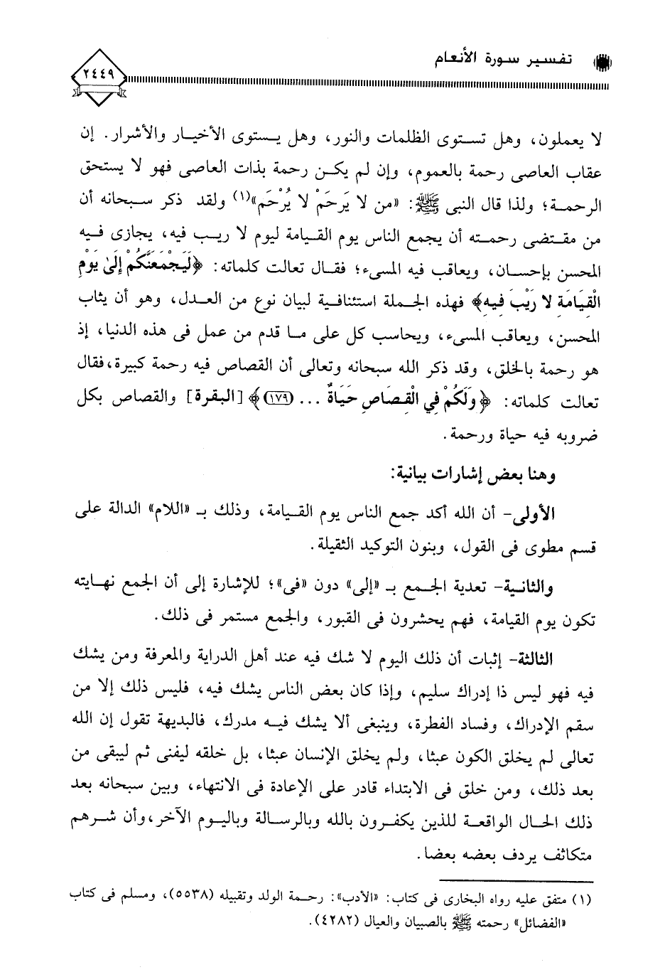 لا يعملون، وهل تستوي الظلمات والنور، وهل يستوي الأخيار والأشرار. إن عقاب العاصي رحمة بالعموم، وإن لم يكن رحمة بذات العاصي فهو لَا يستحق الرحمة؛ ولذا قال النبي - صلى الله عليه وسلم -: " من لَا يَرحَمْ لَا يُرْحَم " (¬1) ولقد ذكر سبحانه أن من مقتضى رحمته أن يجمع الناس يوم القيامة ليوم لَا ريب فيه، يجازى فيه المحسن بإحسان، ويعاقب فيه السيئ؛ فقال تعالت كلماته: (لَيَجْمَعَنَّكمْ إِلَى يَوْمِ الْقِيَامَةِ لَا رَيْبَ فِيهِ) فهذه الجملة استئنافية لبيان نوع من العدل، وهو أن يثاب المحسن، ويعاقب السيئ، ويحاسب كل على ما قدم من عمل في هذه الدنيا، إذ هو رحمة بالخلق، وقد ذكر الله سبحانه وتعالى أن القصاص فيه رحمة كبيرة، فقال تعالت كلماته: (وَلَكُمْ فِي الْقِصَاصِ حَيَاةٌ. . .)، والقصاص بكل ضروبه فيه حياة ورحمة.