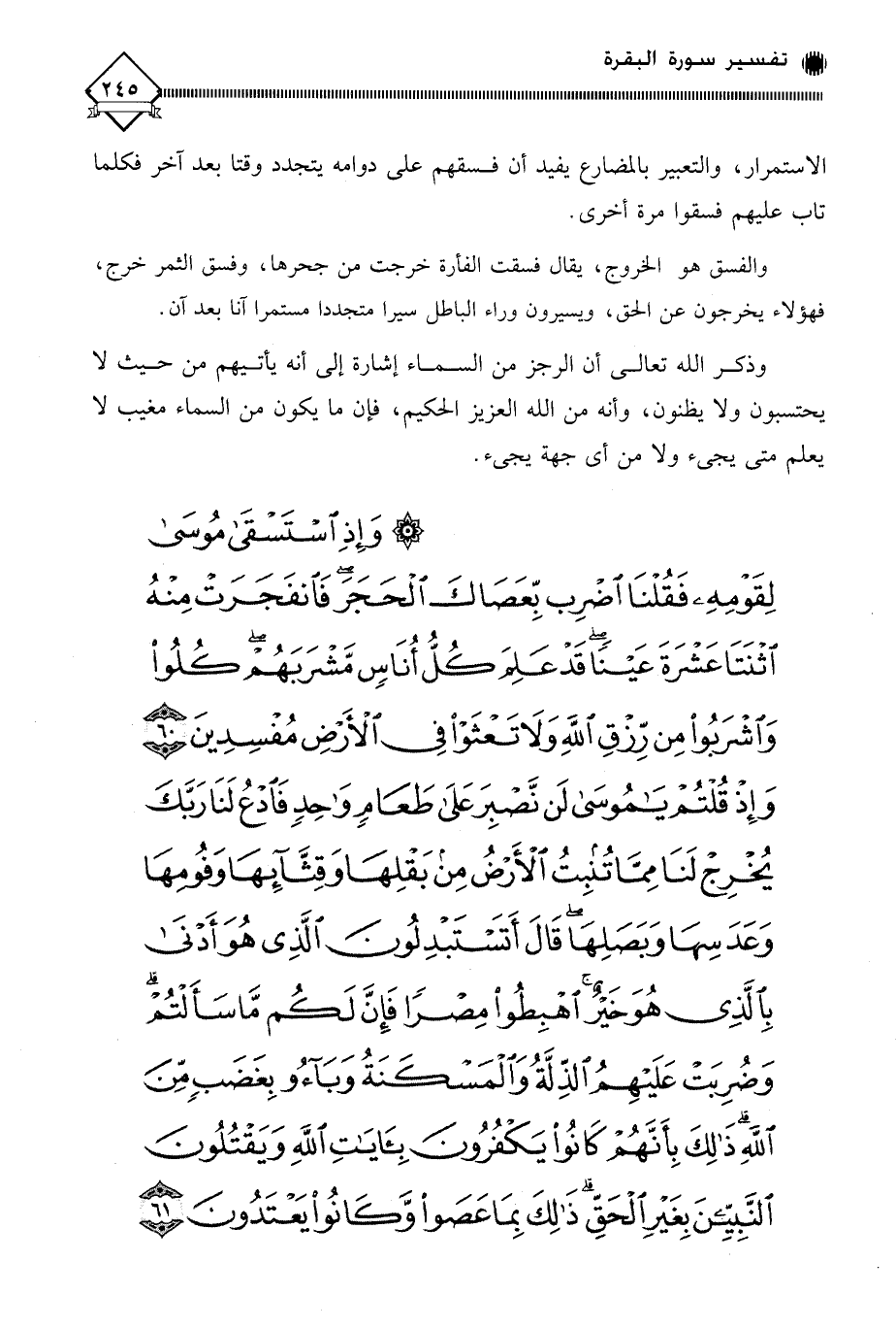 (وَإِذِ اسْتَسْقَى مُوسَى لِقَوْمِهِ فَقُلْنَا اضْرِبْ بِعَصَاكَ الْحَجَرَ فَانْفَجَرَتْ مِنْهُ اثْنَتَا عَشْرَةَ عَيْنًا قَدْ عَلِمَ كُلُّ أُنَاسٍ مَشْرَبَهُمْ كُلُوا وَاشْرَبُوا مِنْ رِزْقِ اللَّهِ وَلَا تَعْثَوْا فِي الْأَرْضِ مُفْسِدِينَ (60) وَإِذْ قُلْتُمْ يَا مُوسَى لَنْ نَصْبِرَ عَلَى طَعَامٍ وَاحِدٍ فَادْعُ لَنَا رَبَّكَ يُخْرِجْ لَنَا مِمَّا تُنْبِتُ الْأَرْضُ مِنْ بَقْلِهَا وَقِثَّائِهَا وَفُومِهَا وَعَدَسِهَا وَبَصَلِهَا قَالَ أَتَسْتَبْدِلُونَ الَّذِي هُوَ أَدْنَى بِالَّذِي هُوَ خَيْرٌ اهْبِطُوا مِصْرًا فَإِنَّ لَكُمْ مَا سَأَلْتُمْ وَضُرِبَتْ عَلَيْهِمُ الذِّلَّةُ وَالْمَسْكَنَةُ وَبَاءُوا بِغَضَبٍ مِنَ اللَّهِ ذَلِكَ بِأَنَّهُمْ كَانُوا يَكْفُرُونَ بِآيَاتِ اللَّهِ وَيَقْتُلُونَ النَّبِيِّينَ بِغَيْرِ الْحَقِّ ذَلِكَ بِمَا عَصَوْا وَكَانُوا يَعْتَدُونَ (61)