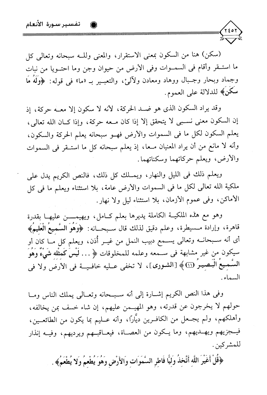 (سكن) هنا من السكون بمعنى الاستقرار، والمعنى ولله سبحانه وتعالى كل ما استقر وأقام في السماوات وفي الأرض من حيوان وجن وما احتويا من نبات وجماد وبحار وجبال ووهاد ومعادن ولآلئ، والتعبير بـ " ما " في قوله: (وَلَهُ مَا سَكَنَ) للدلالة على العموم.