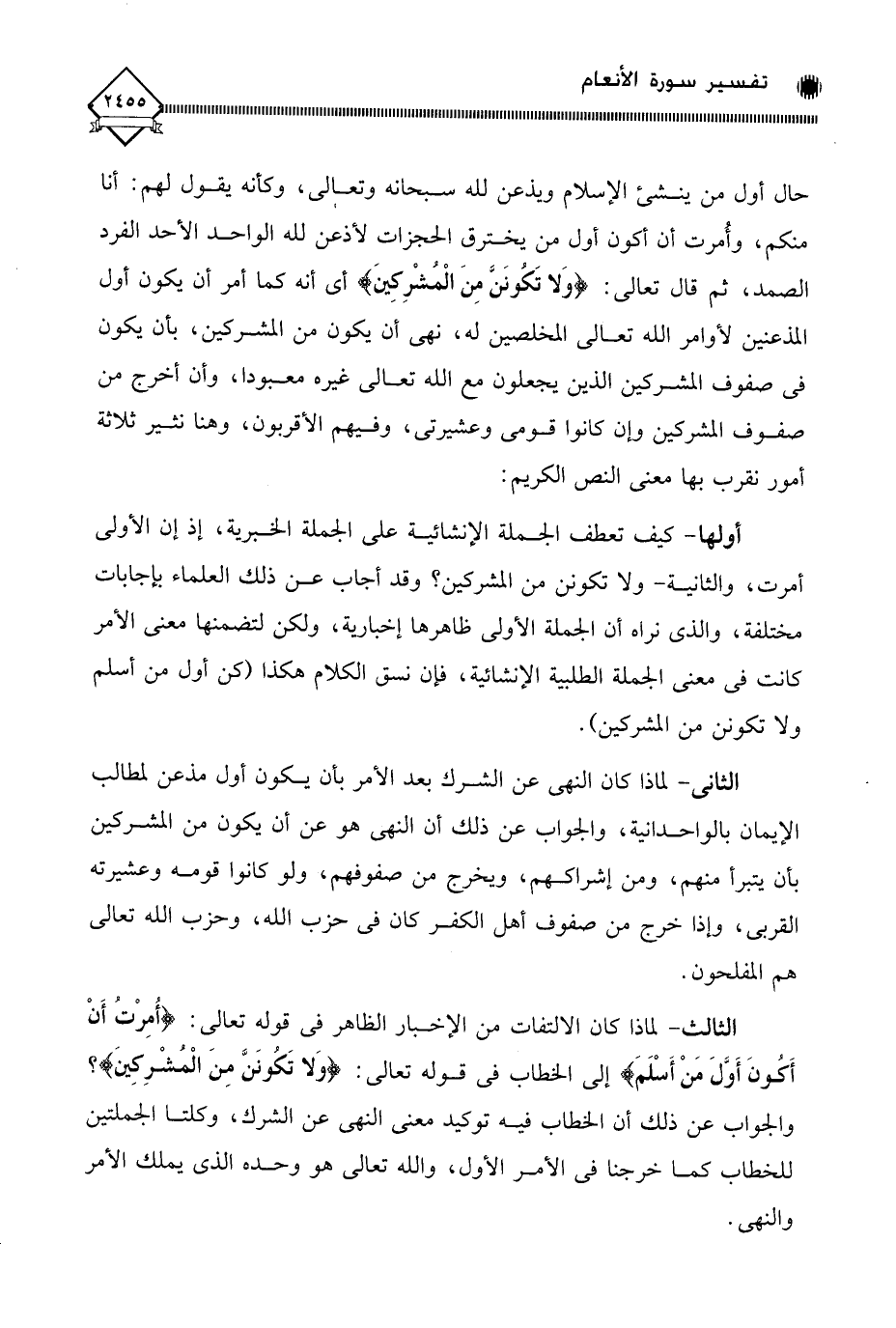 أولها - كيف تعطف الجملة الإنشائية على الجملة الخبرية، إذ إن الأولى أمرت، والثانية - ولا تكونن من المشركين؟ وقد أجاب عن ذلك العلماء بإجابات مختلفة، والذي نراه أن الجملة الأولى ظاهرها إخبارية، ولكن لتضمنها معنى الأمر كانت في معنى الجملة الطلبية الإنشائية، فإن نسق الكلام هكذا (كن أول من أسلم ولا تكونن من المشركين).