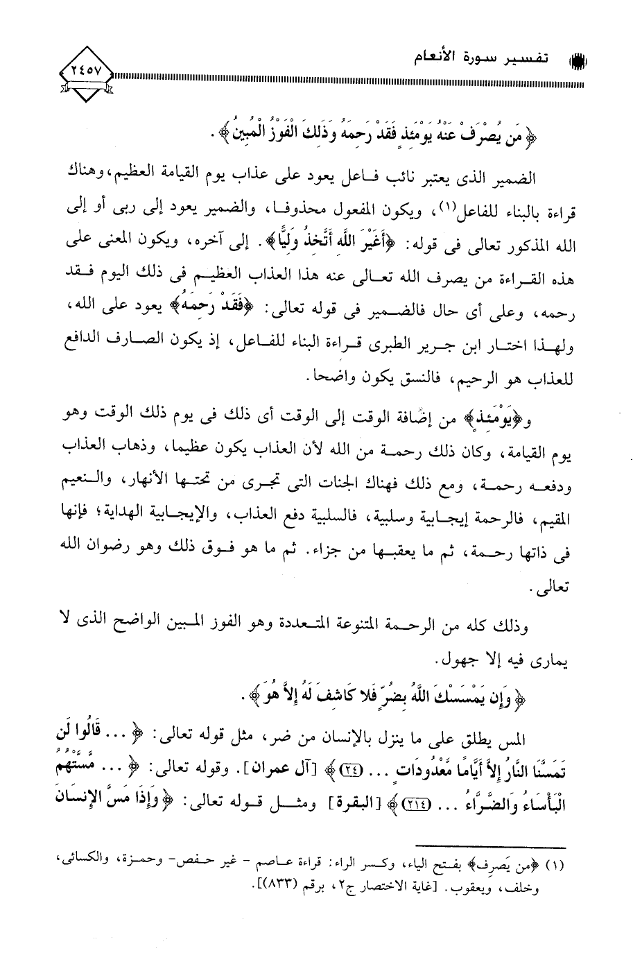 الضمير الذي يعتبر نائب فاعل يعود على عذاب يوم القيامة العظيم، وهناك قراءة بالبناء للفاعل (¬1)، ويكون المفعول محذوفا، والضمير يعود إلى ربي أو إلى الله المذكور تعالى في قوله: (أَغَيْرَ اللَّهِ أَتَّخِذُ وَلِيًّا). إلى آخره، ويكون المعنى على هذه القراءة من يصرف الله تعالى عنه هذا العذاب العظيم في ذلك اليوم فقد رحمه، وعلى أي حال فالضمير في قوله تعالى: (فَقَدْ رَحِمَهُ) يعود على الله، ولهذا اختار ابن جرير الطبري قراءة البناء للفاعل، إذ يكون الصارف الدافع للعذاب هو الرحيم، فالنسق يكون واضحا.