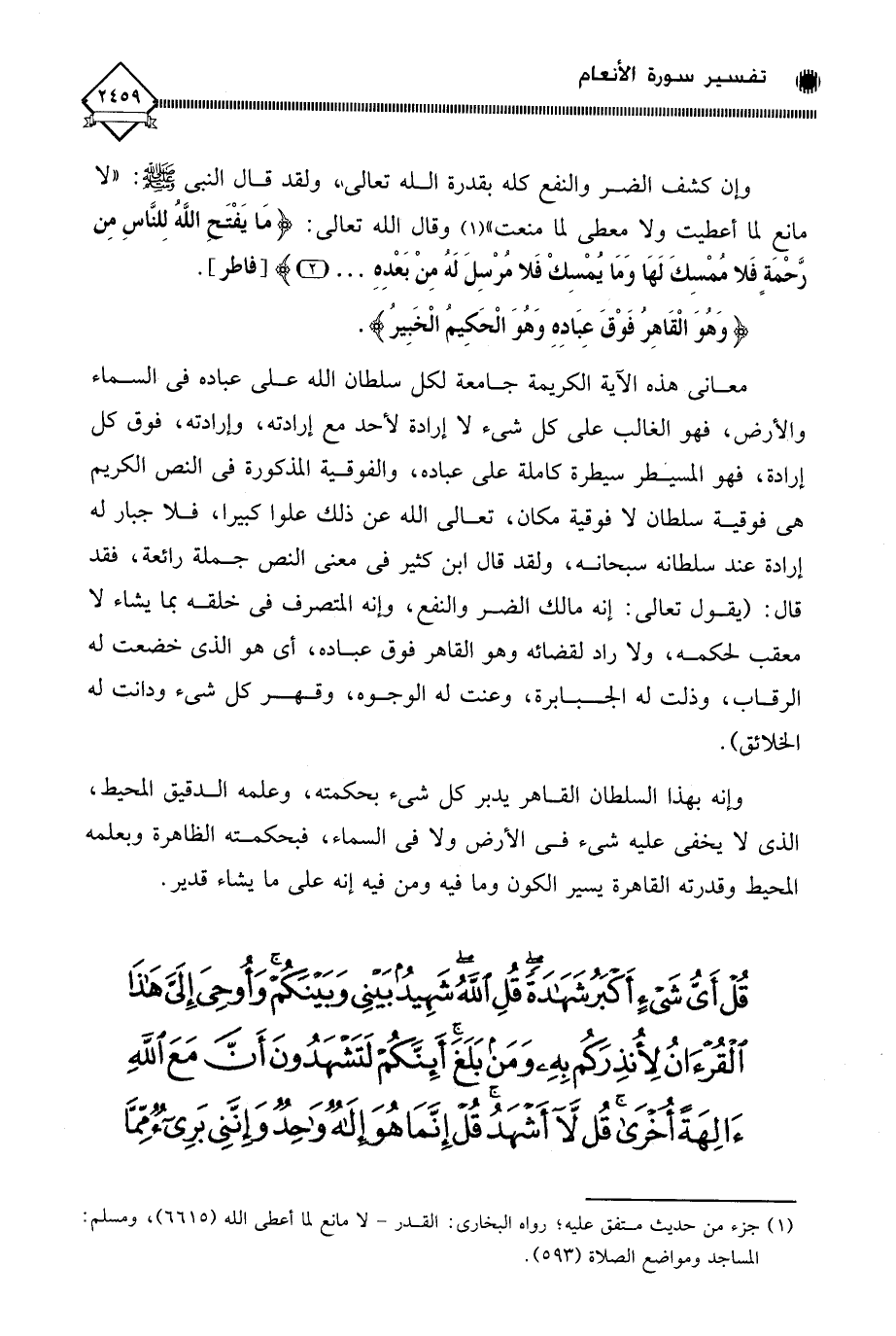 معاني هذه الآية الكريمة جامعة لكل سلطان الله على عباده في السماء والأرض، فهو الغالب على كل شيء لَا إرادة لأحد مع إرادته، وإرادته، فوق كل إرادة، فهو المسيطر سيطرة كاملة على عباده، والفوقية المذكورة في النص الكريم هي فوقية سلطان لَا فوقية مكان، تعالى الله عن ذلك علوا كبيرا، فلا جبار له إرادة عند سلطانه سبحانه، ولقد قال ابن كثير في معنى النص جملة رائعة، فقد قال: (يقول تعالى: إنه مالك الضر والنفع، وإنه المتصرف في خلقه بما يشاء لا معقب لحكمه، ولا راد لقضائه وهو القاهر فوق عباده، أي هو الذي خضعت له الرقاب، وذلت له الجبابرة، وعنت له الوجوه، وقهر كل شيء ودانت له الخلائق).