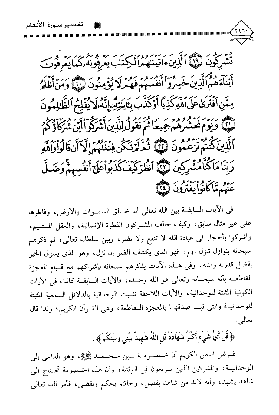 تُشْرِكُونَ (19) الَّذِينَ آتَيْنَاهُمُ الْكِتَابَ يَعْرِفُونَهُ كَمَا يَعْرِفُونَ أَبْنَاءَهُمُ الَّذِينَ خَسِرُوا أَنْفُسَهُمْ فَهُمْ لَا يُؤْمِنُونَ (20) وَمَنْ أَظْلَمُ مِمَّنِ افْتَرَى عَلَى اللَّهِ كَذِبًا أَوْ كَذَّبَ بِآيَاتِهِ إِنَّهُ لَا يُفْلِحُ الظَّالِمُونَ (21) وَيَوْمَ نَحْشُرُهُمْ جَمِيعًا ثُمَّ نَقُولُ لِلَّذِينَ أَشْرَكُوا أَيْنَ شُرَكَاؤُكُمُ الَّذِينَ كُنْتُمْ تَزْعُمُونَ (22) ثُمَّ لَمْ تَكُنْ فِتْنَتُهُمْ إِلَّا أَنْ قَالُوا وَاللَّهِ رَبِّنَا مَا كُنَّا مُشْرِكِينَ (23) انْظُرْ كَيْفَ كَذَبُوا عَلَى أَنْفُسِهِمْ وَضَلَّ عَنْهُمْ مَا كَانُوا يَفْتَرُونَ (24)