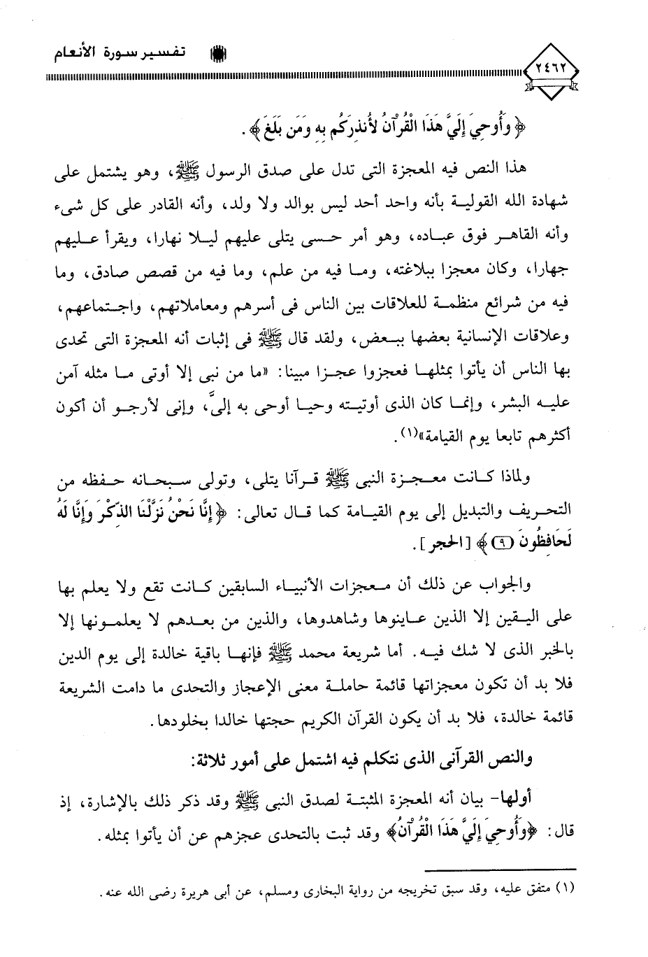 هذا النص فيه المعجزة التي تدل على صدق الرسول - صلى الله عليه وسلم -، وهو يشتمل على شهادة الله القولية بأنه واحد أحد ليس بوالد ولا ولد، وأنه القادر على كل شيء وأنه القاهر فوق عباده، وهو أمر حسي يتلى عليهم ليلا نهارا، ويقرأ عليهم جهارا، وكان معجزا ببلاغته، وما فيه من علم، وما فيه من قصص صادق، وما فيه من شرائع منظمة للعلاقات بين الناس في أسرهم ومعاملاتهم، واجتماعهم، وعلاقات الإنسانية بعضها ببعض، ولقد قال - صلى الله عليه وسلم - في إثبات أنه المعجزة التي تحدى بها الناس أن يأتوا بمثلها فعجزوا عجزا مبينا: " ما من نبي إلا أوتي ما مثله آمن عليه البشر، وإنما كان الذي أوتيته وحيا أوحي به إليَّ، وإني لأرجو أن أكون أكثرهم تابعا يوم القيامة " (¬1).