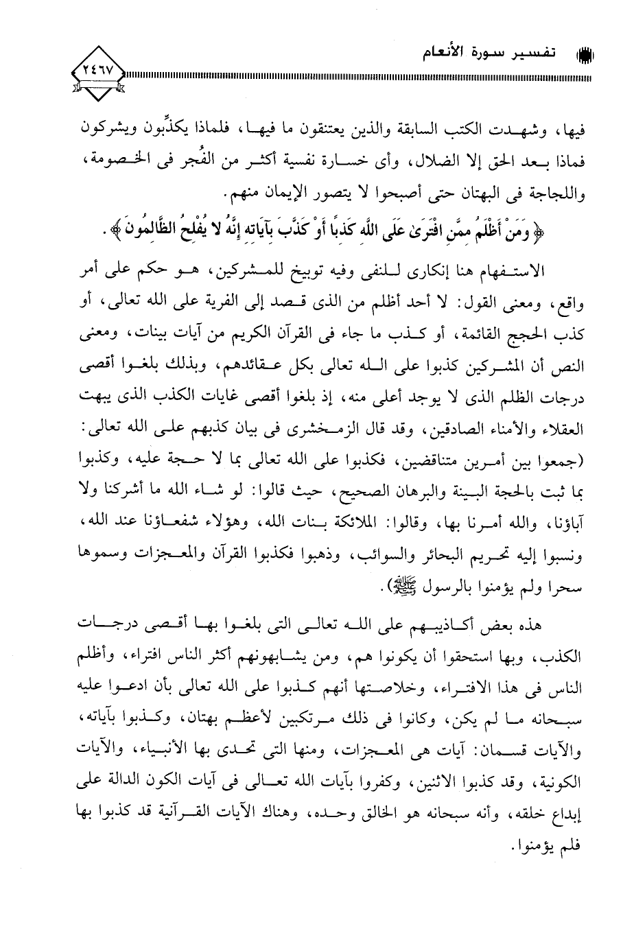 الاستفهام هنا إنكاري للنفي وفيه توبيخ للمشركين، هو حكم على أمر واقع، ومعنى القول: لَا أحد أظلم من الذي قصد إلى الفرية على الله تعالى، أو كذب الحجج القائمة، أو كذب ما جاء في القرآن الكريم من آيات بينات، ومعنى النص أن المشركين كذبوا على الله تعالى بكل عقائدهم، وبذلك بلغوا أقصى درجات الظلم الذي لَا يوجد أعلى منه، إذ بلغوا أقصى غايات الكذب الذي يبهت العقلاء والأمناء الصادقين، وقد قال الزمخشري في بيان كذبهم على الله تعالى: (جمعوا بين أمرين متناقضين، فكذبوا على الله تعالى بما لَا حجة عليه، وكذبوا بما ثبت بالحجة البينة والبرهان الصحيح، حيث قالوا: لو شاء الله ما أشركنا ولا آباؤنا، والله أمرنا بها، وقالوا: الملائكة بنات الله، وهؤلاء شفعاؤنا عند الله، ونسبوا إليه تحريم البحائر والسوائب، وذهبوا فكذبوا القرآن والمعجزات وسموها سحرا ولم يؤمنوا بالرسول - صلى الله عليه وسلم).