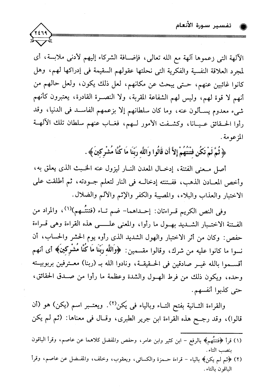 (¬1) قرأ (فِتْنَتُهُمْ) بالرفع - ابن كثير وابن عامر، وحفص والمفضل كلاهما عن عاصم، وقرأ الباقون بنصب التاء.