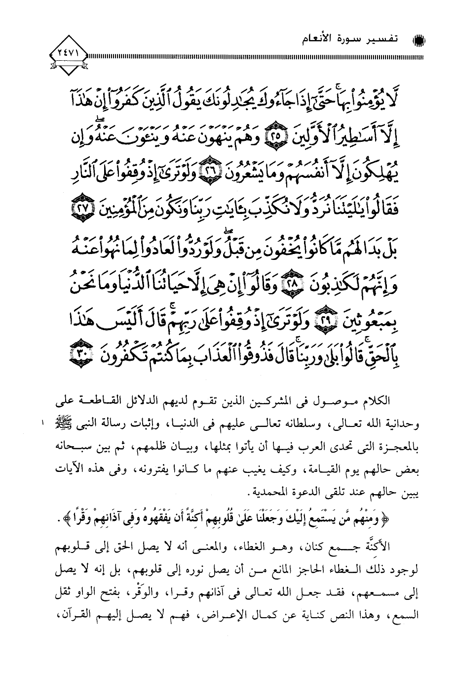 لَا يُؤْمِنُوا بِهَا حَتَّى إِذَا جَاءُوكَ يُجَادِلُونَكَ يَقُولُ الَّذِينَ كَفَرُوا إِنْ هَذَا إِلَّا أَسَاطِيرُ الْأَوَّلِينَ (25) وَهُمْ يَنْهَوْنَ عَنْهُ وَيَنْأَوْنَ عَنْهُ وَإِنْ يُهْلِكُونَ إِلَّا أَنْفُسَهُمْ وَمَا يَشْعُرُونَ (26) وَلَوْ تَرَى إِذْ وُقِفُوا عَلَى النَّارِ فَقَالُوا يَا لَيْتَنَا نُرَدُّ وَلَا نُكَذِّبَ بِآيَاتِ رَبِّنَا وَنَكُونَ مِنَ الْمُؤْمِنِينَ (27) بَلْ بَدَا لَهُمْ مَا كَانُوا يُخْفُونَ مِنْ قَبْلُ وَلَوْ رُدُّوا لَعَادُوا لِمَا نُهُوا عَنْهُ وَإِنَّهُمْ لَكَاذِبُونَ (28) وَقَالُوا إِنْ هِيَ إِلَّا حَيَاتُنَا الدُّنْيَا وَمَا نَحْنُ بِمَبْعُوثِينَ (29) وَلَوْ تَرَى إِذْ وُقِفُوا عَلَى رَبِّهِمْ قَالَ أَلَيْسَ هَذَا بِالْحَقِّ قَالُوا بَلَى وَرَبِّنَا قَالَ فَذُوقُوا الْعَذَابَ بِمَا كُنْتُمْ تَكْفُرُونَ (30)