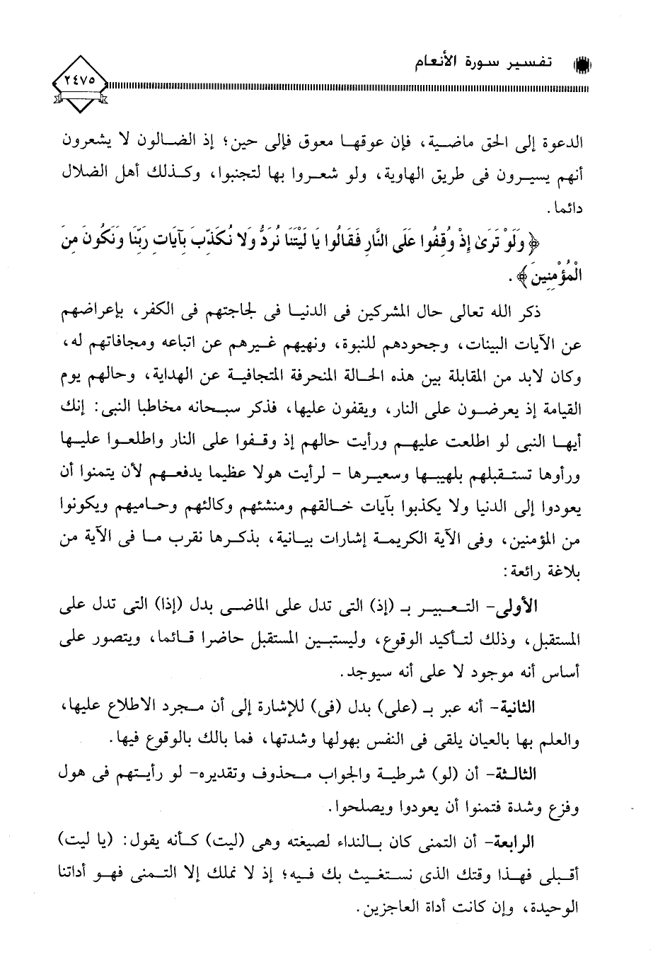 (وَلَوْ تَرَى إِذْ وُقِفُوا عَلَى النَّارِ فَقَالُوا يَا لَيْتَنَا نُرَدُّ وَلَا نُكَذِّبَ بِآيَاتِ رَبِّنَا وَنَكُونَ مِنَ الْمُؤْمِنِينَ (27)