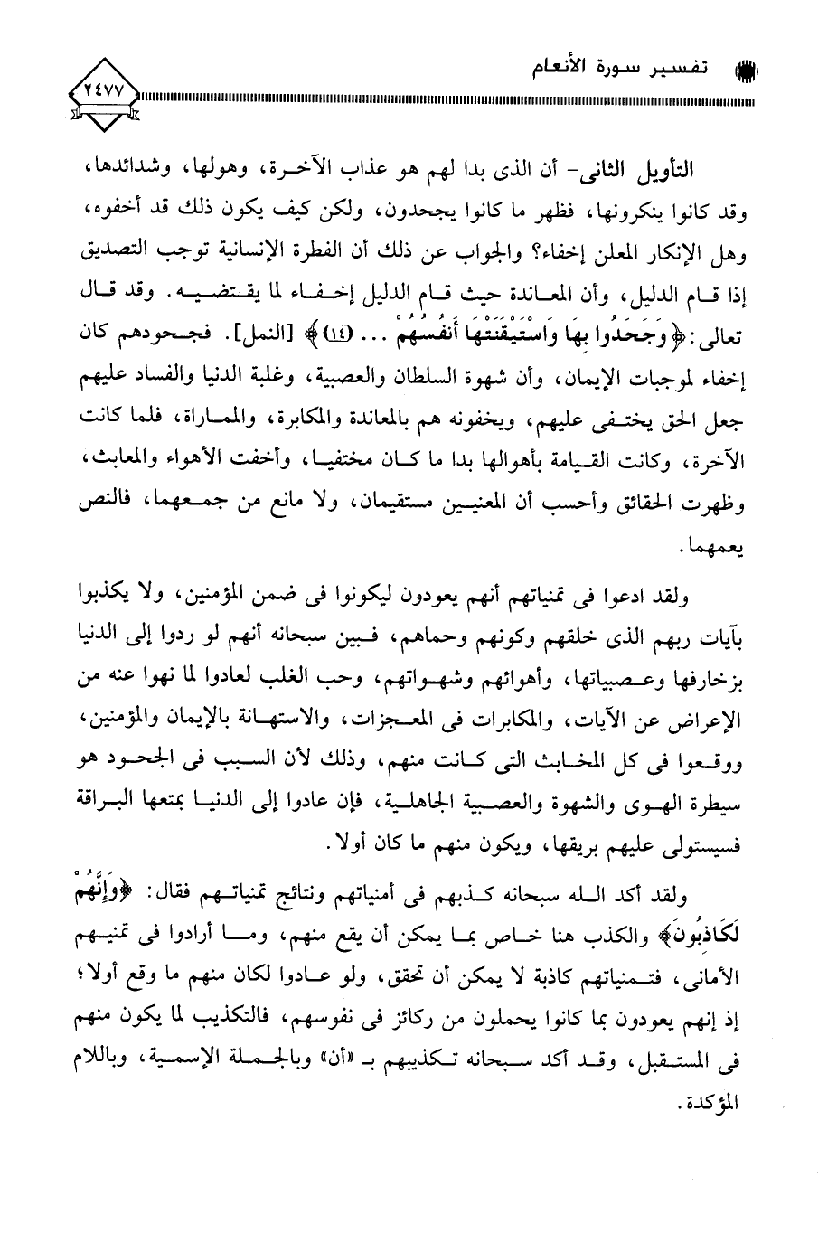 التأويل الثاني - أن الذي بدا لهم هو عذاب الآخرة، وهولها، وشدائدها، وقد كانوا ينكرونها، فظهر ما كانوا يجحدون، ولكن كيف يكون ذلك قد أخفوه، وهل الإنكار المعلن إخفاء؟ والجواب عن ذلك أن الفطرة الإنسانية توجب التصديق إذا قام الدليل، وأن المعاندة حيث قام الدليل إخفاء لما يقتضيه. وقد قال تعالى: (وَجَحَدُوا بِهَا وَاسْتَيْقَنَتْهَا أَنفُسُهُمْ. . .). فجحودهم كان إخفاء لموجبات الإيمان، وأن شهوة السلطان والعصبية، وغلبة الدنيا والفساد عليهم جعل الحق يختفي عليهم، ويخفونه هم بالمعاندة والمكابرة، والمماراة، فلما كانت الآخرة، وكانت القيامة بأهوالها بدا ما كان مختفيا، وأخفت الأهواء والمعابث، وظهرت الحقائق وأحسب أن المعنيين مستقيمان، ولا مانع من جمعهما، فالنص يعمهما.
