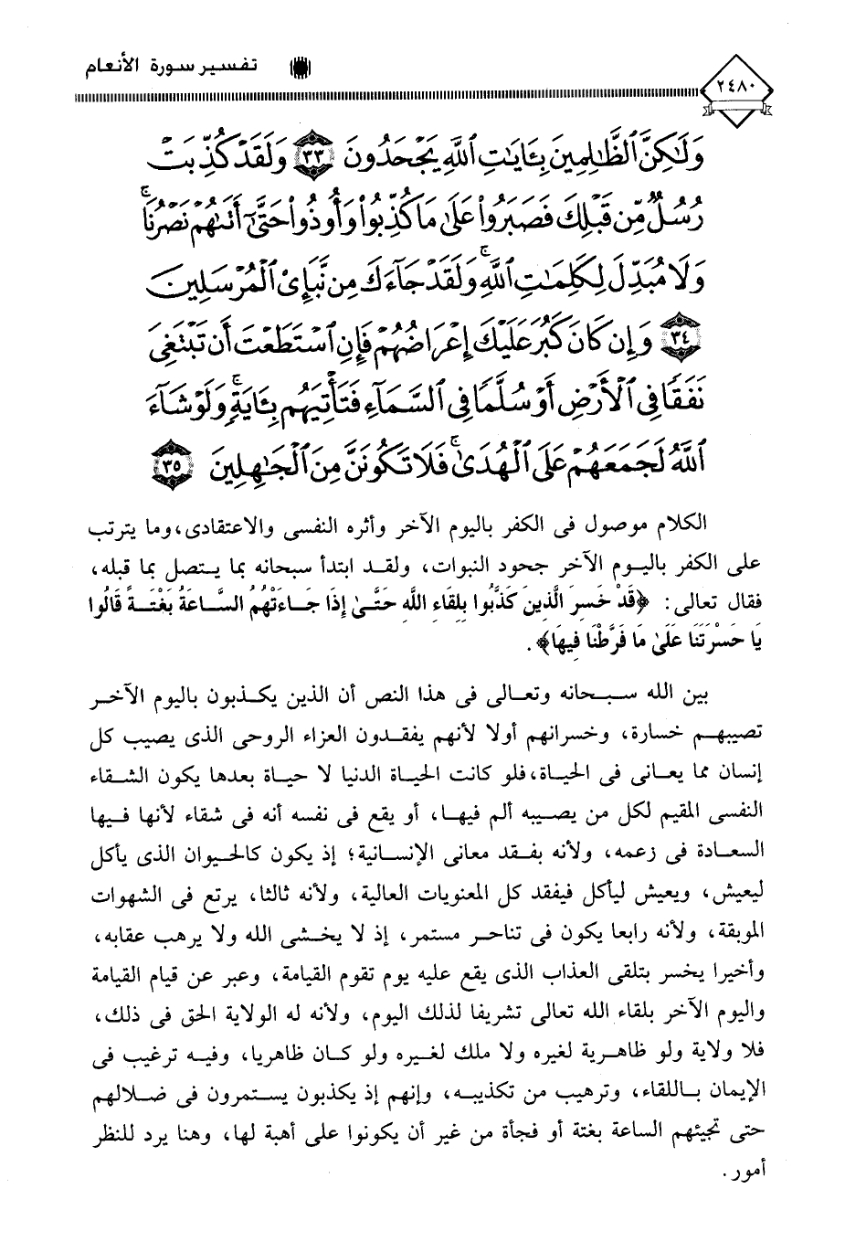 وَلَكِنَّ الظَّالِمِينَ بِآيَاتِ اللَّهِ يَجْحَدُونَ (33) وَلَقَدْ كُذِّبَتْ رُسُلٌ مِنْ قَبْلِكَ فَصَبَرُوا عَلَى مَا كُذِّبُوا وَأُوذُوا حَتَّى أَتَاهُمْ نَصْرُنَا وَلَا مُبَدِّلَ لِكَلِمَاتِ اللَّهِ وَلَقَدْ جَاءَكَ مِنْ نَبَإِ الْمُرْسَلِينَ (34) وَإِنْ كَانَ كَبُرَ عَلَيْكَ إِعْرَاضُهُمْ فَإِنِ اسْتَطَعْتَ أَنْ تَبْتَغِيَ نَفَقًا فِي الْأَرْضِ أَوْ سُلَّمًا فِي السَّمَاءِ فَتَأْتِيَهُمْ بِآيَةٍ وَلَوْ شَاءَ اللَّهُ لَجَمَعَهُمْ عَلَى الْهُدَى فَلَا تَكُونَنَّ مِنَ الْجَاهِلِينَ (35)