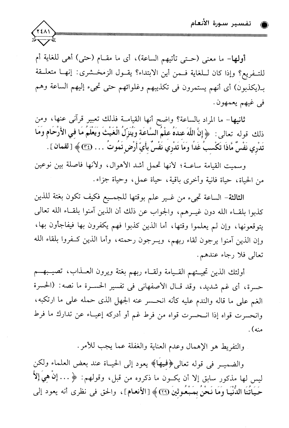 ثانيها - ما المراد بالساعة؟ واضح أنها القيامة فذلك تعبير قرآني عنها، ومن ذلك قوله تعالى: (إِنَّ اللَّهَ عِنْدَهُ عِلْمُ السَّاعَةِ وَيُنَزِّلُ الْغَيْثَ وَيَعْلَمُ مَا فِي الْأَرْحَامِ وَمَا تَدْرِي نَفْسٌ مَاذَا تَكْسِبُ غَدًا وَمَا تَدْرِي نَفْسٌ بِأَيِّ أَرْضٍ تَمُوتُ. . .).