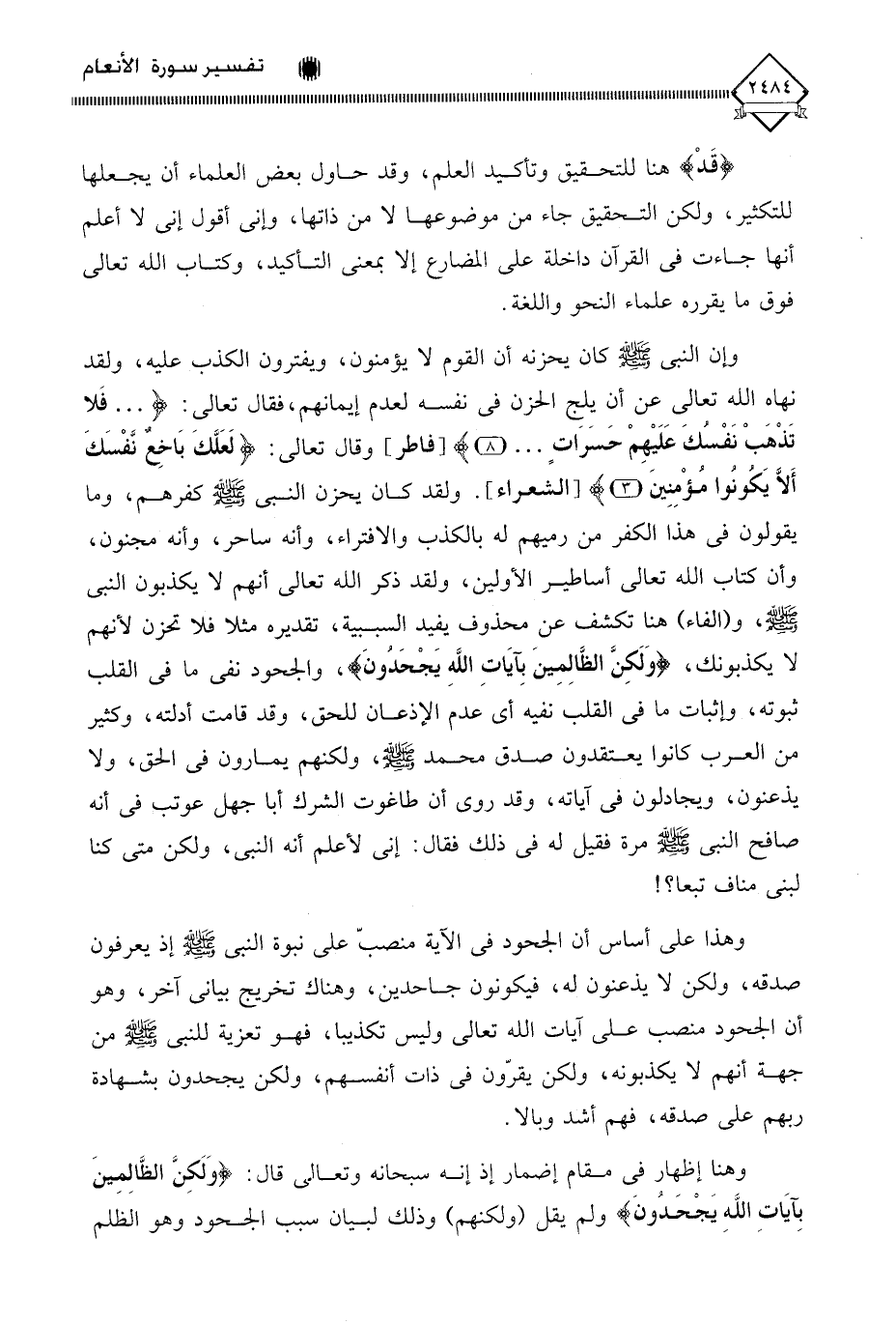 وإن النبي - صلى الله عليه وسلم - كان يحزنه أن القوم لَا يؤمنون، ويفترون الكذب عليه، ولقد نهاه الله تعالى عن أن يلج الحزن في نفسه لعدم إيمانهم، فقال تعالى: (. . . فَلا تَذْهَبْ نَفْسُكَ عَلَيْهِمْ حَسَرَاتٍ. . .)، وقال تعالى: (لَعَلَّكَ بَاخِعٌ نفْسَكَ أَلَّا يَكُونُوا مُؤْمنِينَ). ولقد كان يحزن النبي - صلى الله عليه وسلم - كفرهم، وما يقولون في هذا الكفر من رميهم له بالكذب والافتراء، وأنه ساحر، وأنه مجنون، وأن كتاب الله تعالى أساطير الأولين، ولقد ذكر الله تعالى أنهم لَا يكذبون النبي - صلى الله عليه وسلم -، و (الفاء) هنا تكشف عن محذوف يفيد السببية، تقديره مثلا فلا تحزن لأنهم لا يكذبونك، (وَلَكِنَّ الظَّالِمِينَ بِآيَاتِ اللَّهِ)، والجحود نفي ما في القلب ثبوته، وإثبات ما في القلب نفيه أي عدم الإذعان للحق، وقد قامت أدلته، وكثير من العرب كانوا يعتقدون صدق محمد - صلى الله عليه وسلم -، ولكنهم يمارون في الحق، ولا يذعنون، ويجادلون في آياته، وقد روي أن طاغوت الشرك أبا جهل عوتب في أنه صافح النبي - صلى الله عليه وسلم - مرة فقيل له في ذلك فقال: إني لأعلم أنه النبي، ولكن متى كنا لبني مناف تبعا؟!