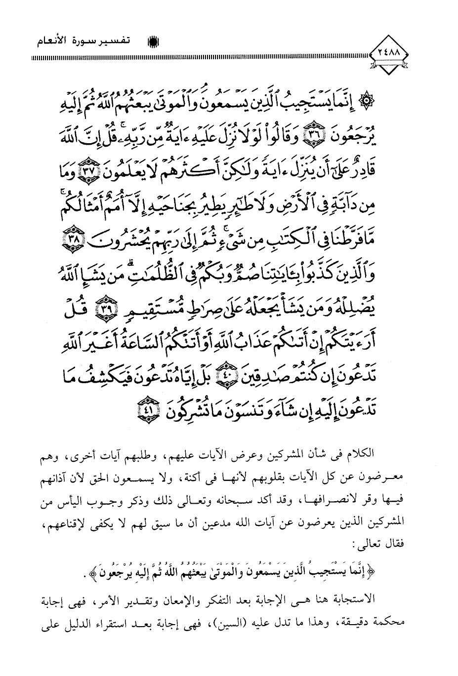 (إِنَّمَا يَسْتَجِيبُ الَّذِينَ يَسْمَعُونَ وَالْمَوْتَى يَبْعَثُهُمُ اللَّهُ ثُمَّ إِلَيْهِ يُرْجَعُونَ (36) وَقَالُوا لَوْلَا نُزِّلَ عَلَيْهِ آيَةٌ مِنْ رَبِّهِ قُلْ إِنَّ اللَّهَ قَادِرٌ عَلَى أَنْ يُنَزِّلَ آيَةً وَلَكِنَّ أَكْثَرَهُمْ لَا يَعْلَمُونَ (37) وَمَا مِنْ دَابَّةٍ فِي الْأَرْضِ وَلَا طَائِرٍ يَطِيرُ بِجَنَاحَيْهِ إِلَّا أُمَمٌ أَمْثَالُكُمْ مَا فَرَّطْنَا فِي الْكِتَابِ مِنْ شَيْءٍ ثُمَّ إِلَى رَبِّهِمْ يُحْشَرُونَ (38) وَالَّذِينَ كَذَّبُوا بِآيَاتِنَا صُمٌّ وَبُكْمٌ فِي الظُّلُمَاتِ مَنْ يَشَإِ اللَّهُ يُضْلِلْهُ وَمَنْ يَشَأْ يَجْعَلْهُ عَلَى صِرَاطٍ مُسْتَقِيمٍ (39) قُلْ أَرَأَيْتَكُمْ إِنْ أَتَاكُمْ عَذَابُ اللَّهِ أَوْ أَتَتْكُمُ السَّاعَةُ أَغَيْرَ اللَّهِ تَدْعُونَ إِنْ كُنْتُمْ صَادِقِينَ (40) بَلْ إِيَّاهُ تَدْعُونَ فَيَكْشِفُ مَا تَدْعُونَ إِلَيْهِ إِنْ شَاءَ وَتَنْسَوْنَ مَا تُشْرِكُونَ (41)