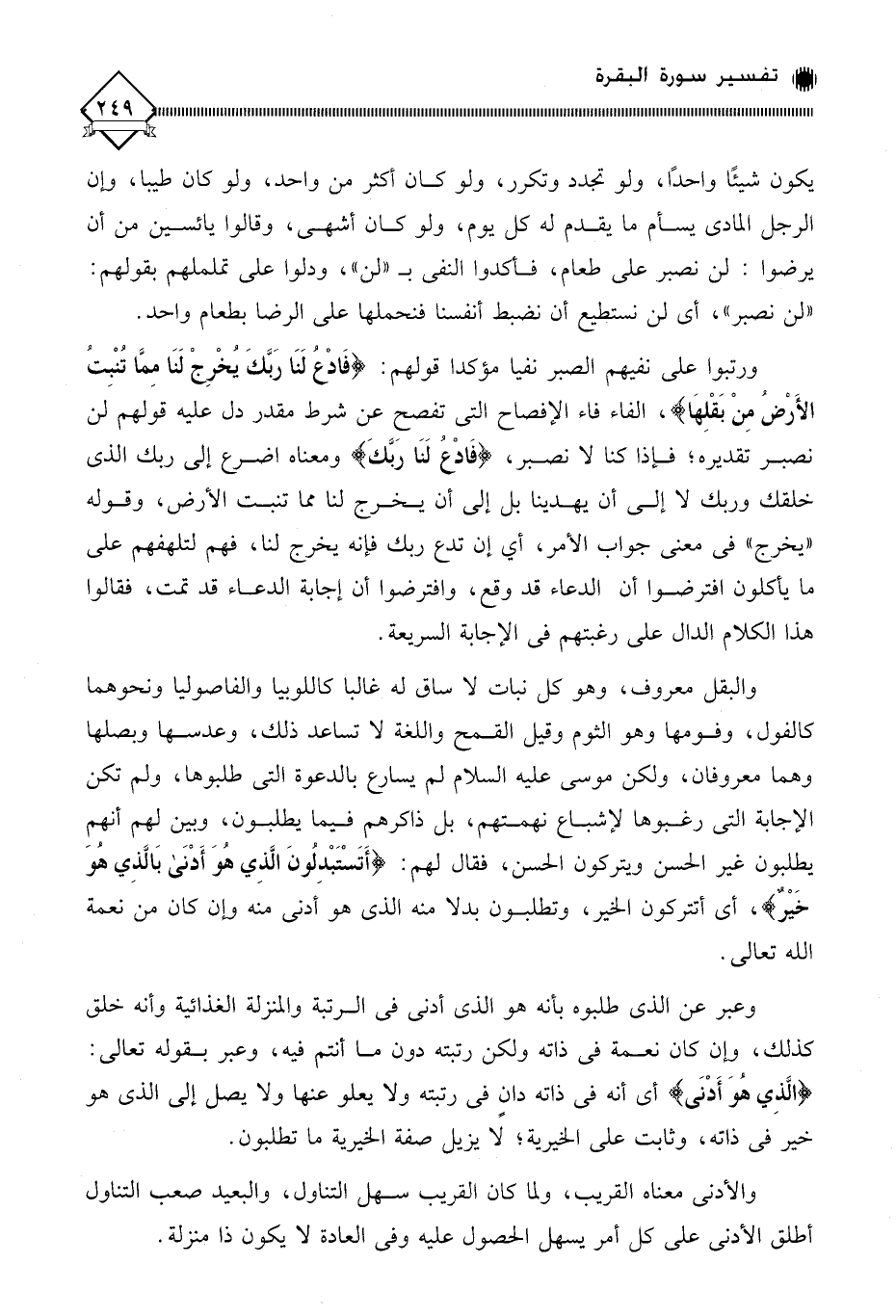 والبقل معروف، وهو كل نبات لَا ساق له غالبا كاللوبيا والفاصوليا ونحوهما كالفول، وفومها وهو الثوم وقيل القمح واللغة لَا تساعد ذلك، وعدسها وبصلها وهما معروفان، ولكن موسى عليه السلام لم يسارع بالدعوة التي طلبوها، ولم تكن الإجابة التي رغبوها لإشباع نهمتهم، بل ذاكرهم فيما يطلبون، وبين لهم أنهم يطلبون غير الحسن ويتركون الحسن، فقال لهم: (أَتَسْتَبْدِلُونَ الَّذِي هُوَ أَدْنَى بَالَّذِي هو خَيْرٌ)، أي أتتركون الخيو، وتطلبون بدلا منه الذي هو أدنى منه هان كان من نعمة الله تعالى.