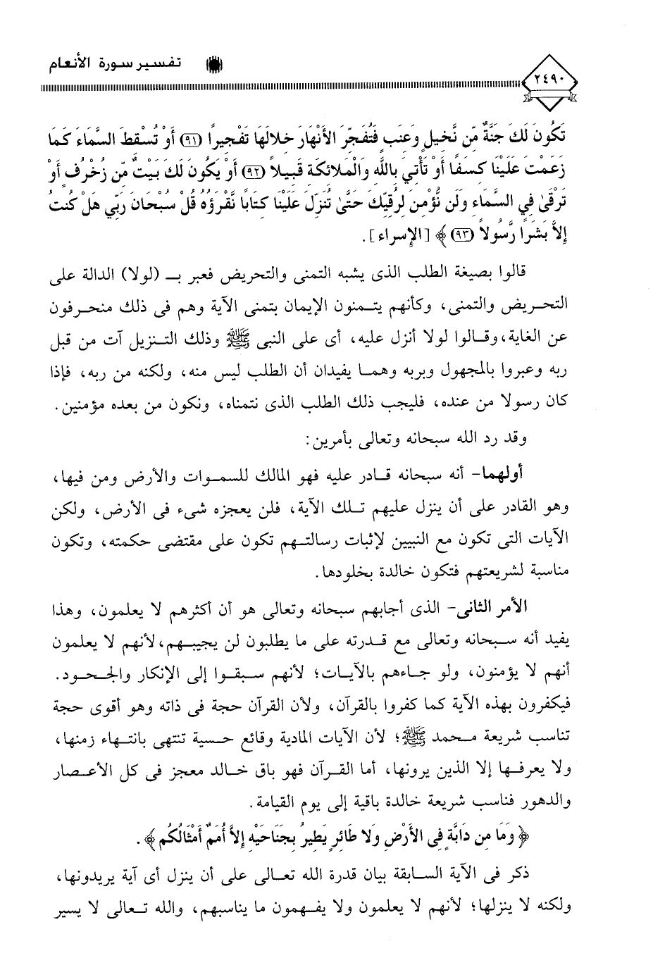 أَوْ تَكُونَ لَكَ جَنَّةٌ مِنْ نَخِيلٍ وَعِنَبٍ فَتُفَجِّرَ الْأَنْهَارَ خِلَالَهَا تَفْجِيرًا (91) أَوْ تُسْقِطَ السَّمَاءَ كَمَا زَعَمْتَ عَلَيْنَا كِسَفًا أَوْ تَأْتِيَ بِاللَّهِ وَالْمَلَائِكَةِ قَبِيلًا (92) أَوْ يَكُونَ لَكَ بَيْتٌ مِنْ زُخْرُفٍ أَوْ تَرْقَى فِي السَّمَاءِ وَلَنْ نُؤْمِنَ لِرُقِيِّكَ حَتَّى تُنَزِّلَ عَلَيْنَا كِتَابًا نَقْرَؤُهُ قُلْ سُبْحَانَ رَبِّي هَلْ كُنْتُ إِلَّا بَشَرًا رَسُولًا (93).