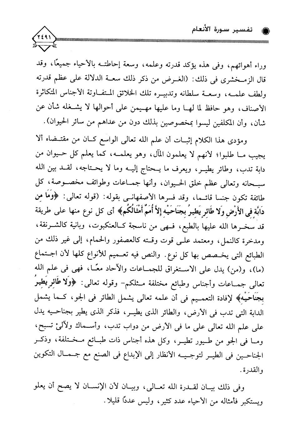 ومؤدى هذا الكلام إثبات أن علم الله تعالى الواسع كان من مقتضاه ألا يجيب ما طلبوا؛ لأنهم لَا يعلمون المآل، وهو يعلمه، كما يعلم كل حيوان من دابة تدب، وطائر يطير، ويعرف ما يحتاج إليه وما لَا يحتاجه، لقد بين الله سبحانه وتعالى عظم خلق الحيوان، وأنها جماعات وطوائف مخصوصة، كل طائفة تكون جنسا قائما، وقد فسرها الأصفهاني بقوله قوله تعالى: (وَمَا مِن دَابَّةٍ فِى الأَرْضِ وَلا طَائِرٍ يَطِير بِجَنَاحَيْهِ إِلَّا أُمَمٌ أَمْثَالُكُم) أي كل نوع منها على طريقة قد سخرها الله عليها بالطبع، فهي من ناسجة كالعنكبوت، وبانية كالشرنقة، ومدخرة كالنمل، ومعتمد على قوت وقته كالعصفور والحمام، إلى غير ذلك من الطبائع التي يخصص بها كل نوع. والنص فيه تعميم للأنواع كلها لأن اجتماع (ما)، و (من) يدل على الاستغراق للجماعات والآحاد معًا، فهي في علم الله تعالى جماعات وأجناس وطبائع مختلفة مثلكم - وقوله تعالى: (وَلا طَائِرٍ يَطِيرُ بِجَنَاحَيْهِ) لإفادة التعميم في أن علمه تعالى يشمل الطائر في الجو، كما يشمل الدابة التي تدب في الأرض، والطائر الذي يطير، فذكر الذي يطير بجناحيه يدل على علم الله تعالى على ما في الأرض من دواب تدب، وأسماك ولآلئ تسبح، وما في الجو من طيور تطير، وكل هذه أجناس ذات طبائع مختلفة، وذكر الجناحين في الطير لتوجيه الأنظار إلى الإبداع في الصنع مع جمال التكوين والقدرة.