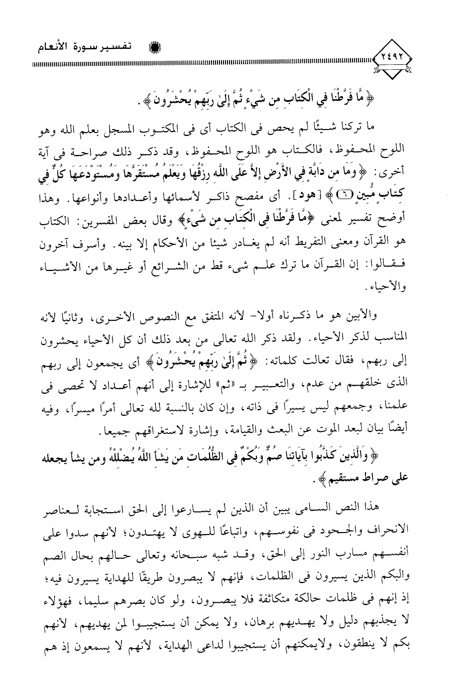 (مَا فَرَّطْنَا فِي الْكِتَابِ مِنْ شَيْءٍ ثُمَّ إِلَى رَبِّهِمْ يُحْشَرُونَ).