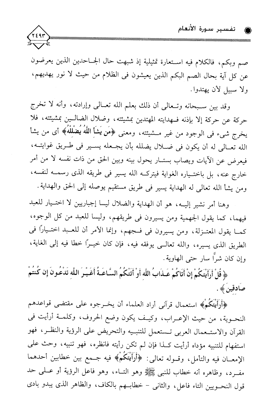 وقد بين سبحانه وتعالى أن ذلك بعلم الله تعالى وإرادته، وأنه لَا تخرج حركة عن حركة إلا بإذنه فهدايته المهتدين بمشيئته، وضلال الضالين بمشيئته، فلا يخرج شيء في الوجود من غير مشيئته، ومعنى (مَن يَشَأِ اللَّهُ يُضْلِلْهُ) أي مَن يَشَأ الله تعالى له أن يكون في ضلال يضلله بأن يجعله يسير في طريق غوايته، فيعرض عن الآيات ويصاب بستار يحول بينه وبين الحق من ذات نفسه لَا من أمر خارج عنه، بل باختياره الغواية فيتركه الله يسير في طريقه الذي رسمه لنفسه، ومن يشأ الله تعالى له الهداية يسير في طريق مستقيم يوصله إلى الحق والهداية.