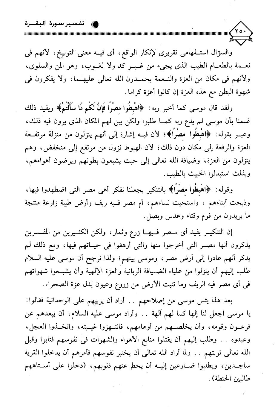 إن التنكير يفيد أي مصر فيها زرع وثمار، ولكن الكثيرين من المفسرين يذكرون أنها مصر التي أخرجوا منها والتي أرهقوا في حياتهم فيها، ومع ذلك لم يذكر أنهم عادوا إلى أرض مصر، وموسى بينهم؛ ولذا نرجح أن موسى عليه السلام طلب إليهم أن ينزلوا من علياء الضيافة الربانية والعزة الإلهية وأن يشبعوا شهواتهم في أي مصر فيه الريف وما تنبت الأرض من زروع وعيون بدل عزة الصحراء.