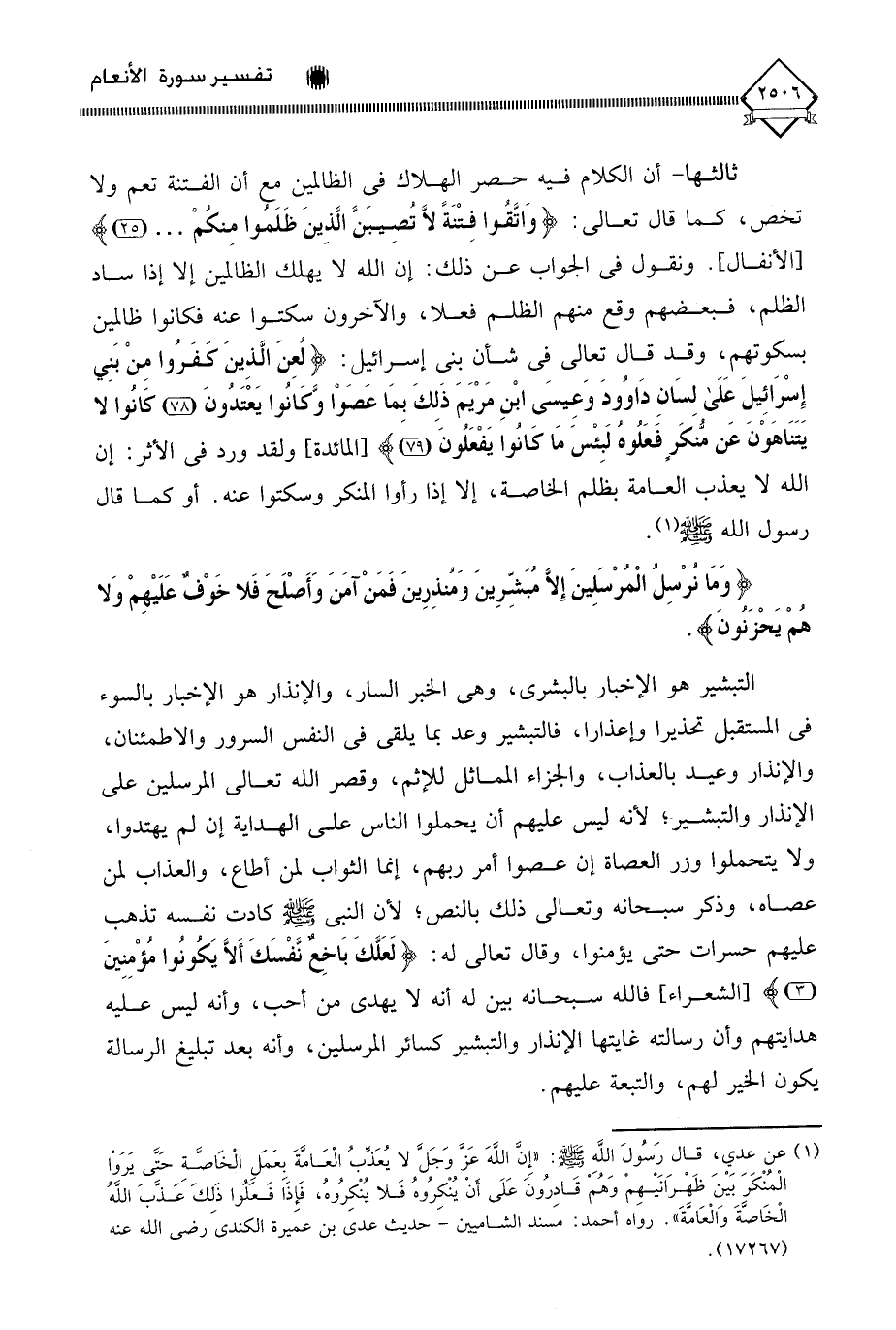 (¬1) عن عدي، قال رَسُولَ اللَّهِ - صلى الله عليه وسلم -: " إِنَّ اللَّهُ عَزً وَجَل لَا يُعَذبُ الْعَامَةَ لعَمَلِ الْخَاصةِ حَتَّى يَرَوا الْمُنكَرَ بَينَ ظَهرَانَيْهِمْ وَهُم قَادرُونَ عَلَى أنْ يُنْكِرُوهُ فَلا يُنْكِرُوهُ، فَإذَا فَعَلُوا ذَلِكَ عَذَّبَ اللَّهُ الْخَاصةَ وَالْعَامَةَ ". رواه أحمد: مَسند الشاميين - حديث عدى بن عمَيرة الكندي رضي الله عنه (17267).