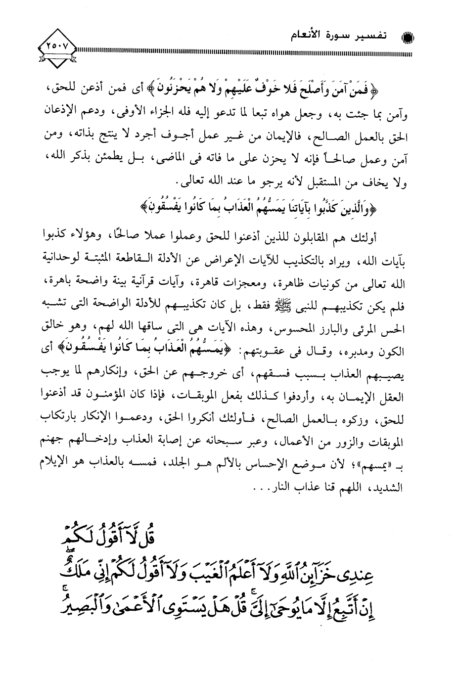 (فَمَنْ آمَنَ وَأَصْلَحَ فَلأ خَوْفٌ عَلَيْهِمْ وَلا هُمْ يَحْزَنُونَ) أي فمن أذعن للحق، وآمن بما جئت به، وجعل هواه تبعا لما تدعو إليه فله الجزاء الأوفى، ودعم الإذعان الحق بالعمل الصالح، فالإيمان من غير عمل أجوف أجرد لَا ينتج بذاته، ومن آمن وعمل صالحا فإنه لَا يحزن على ما فاته في الماضي، بل يطمئن بذكر الله، ولا يخاف من المستقبل لأنه يرجو ما عند الله تعالى.