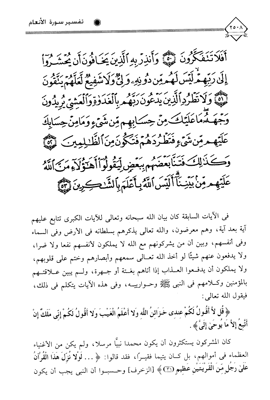 أَفَلَا تَتَفَكَّرُونَ (50) وَأَنْذِرْ بِهِ الَّذِينَ يَخَافُونَ أَنْ يُحْشَرُوا إِلَى رَبِّهِمْ لَيْسَ لَهُمْ مِنْ دُونِهِ وَلِيٌّ وَلَا شَفِيعٌ لَعَلَّهُمْ يَتَّقُونَ (51) وَلَا تَطْرُدِ الَّذِينَ يَدْعُونَ رَبَّهُمْ بِالْغَدَاةِ وَالْعَشِيِّ يُرِيدُونَ وَجْهَهُ مَا عَلَيْكَ مِنْ حِسَابِهِمْ مِنْ شَيْءٍ وَمَا مِنْ حِسَابِكَ عَلَيْهِمْ مِنْ شَيْءٍ فَتَطْرُدَهُمْ فَتَكُونَ مِنَ الظَّالِمِينَ (52) وَكَذَلِكَ فَتَنَّا بَعْضَهُمْ بِبَعْضٍ لِيَقُولُوا أَهَؤُلَاءِ مَنَّ اللَّهُ عَلَيْهِمْ مِنْ بَيْنِنَا أَلَيْسَ اللَّهُ بِأَعْلَمَ بِالشَّاكِرِينَ (53)