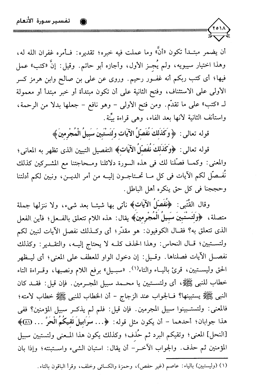 وقال القُتَبى: (نُفَصِّلُ الآيَاتِ) نأتى بها شيئا بعد شيء، ولا ننزلها جملة متصلة، (وَلِتَسْتَبِينَ سَبِيلُ الْمُجْرِمِينَ) يقال: هذه اللام تتعلق بالفعل " فأين - الفعل الذي تتعلق به؛ فقال الكوفيون: هو مقدّر، أي وكذلك نفصل الآيات لنبين لكم ولتستبين؛ قال النحاس: وهذا الحذف كله لَا يحتاج إليه، والتقدير: وكذلك نفصل الآيات فصلناها. وقيل: إن دخول الواو للعطف على المعنى، أي ليظهر الحق وليستبين، قرئ بالياء والتاء (¬1). " سبيل " برفع اللام ونصبها، وقراءة التاء خطاب للنبي - صلى الله عليه وسلم -، أي ولتستبين يا محمد سبيل المجرمين. فإن قيل: فقد كان النبي - صلى الله عليه وسلم - يستبينها؟ فالجواب عند الزجاج - أن الخطاب للنبي - صلى الله عليه وسلم - خطاب لأمته، فالمعنى: ولتستبينوا سبيل المجرمين. فإن قيل: فلم لم يذكر سبيل المؤمنين؟ ففي هذا جوابان: أحدهما - أن يكون مثل قوله: (. . . سَرَابِيلَ تَقِيكُمُ الْحَرَّ. . .).