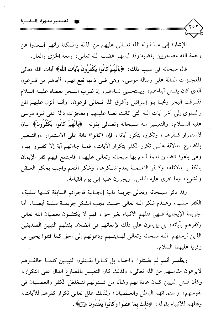 ويظهر أنهم لم يقتلوا واحدا، بل كانوا يقتلون النبيين كلما خالفوهم لا يرعون مقامهم من الله تعالى، ولذلك كان التعبير بالمضارع الدال على التكرار، وكأن قتل النبيين كان عادة لهم وشأنا من شئونهم لتغلغل الكفر والعصيان في نفوسهم، واستمرائهم الباطل والعصيان، ولذلك علل تعالى تكرار كفرهم للآيات، وقتلهم للأنبياء بقوله: (ذَلِكَ بِمَا عَصَوا وَكَانُوا يَعْتَدُونَ).