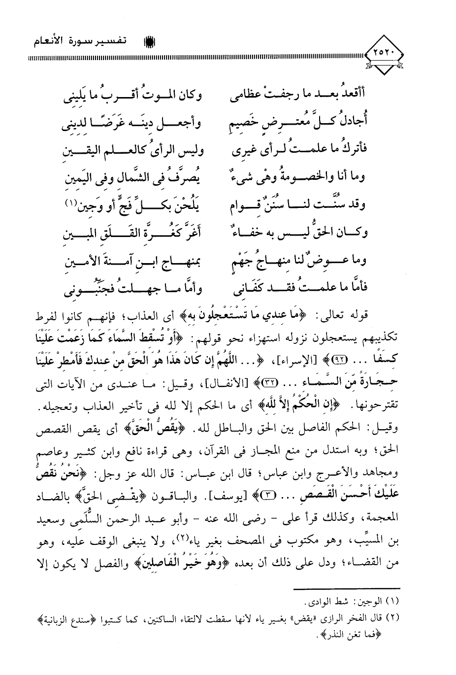 وقيل: الحكم الفاصل بين الحق والباطل لله. (يَقصُّ الْحَقَّ) أي يقص القصص الحق؛ وبه استدل من منع المجاز في القرآن، وهي قراءة نافع وابن كثيرٍ وعاصم ومجاهد والأعرج وابن عباس؛ قال ابن عباس: قال الله عز وجل: (نحْن نَقُصُّ عَلَيْكَ أَحْسَنَ الْقَصَصِ. . .). والباقون (يقْضِي الحقَّ) بالضاد المعجمة، وكذلك قرأ علي - رضي الله عنه - وأبو عبد الرحمن السُّلَمِي وسعيد بن المسيِّب، وهو مكتوب في المصحف بغير ياء (¬2)، ولا ينبغي الوقف عليه، وهو من القضاء؛ ودل على ذلك أن بعده (وَهُوَ خَيْرُ الْفَاصِلِينَ) والفصل لَا يكون إلا