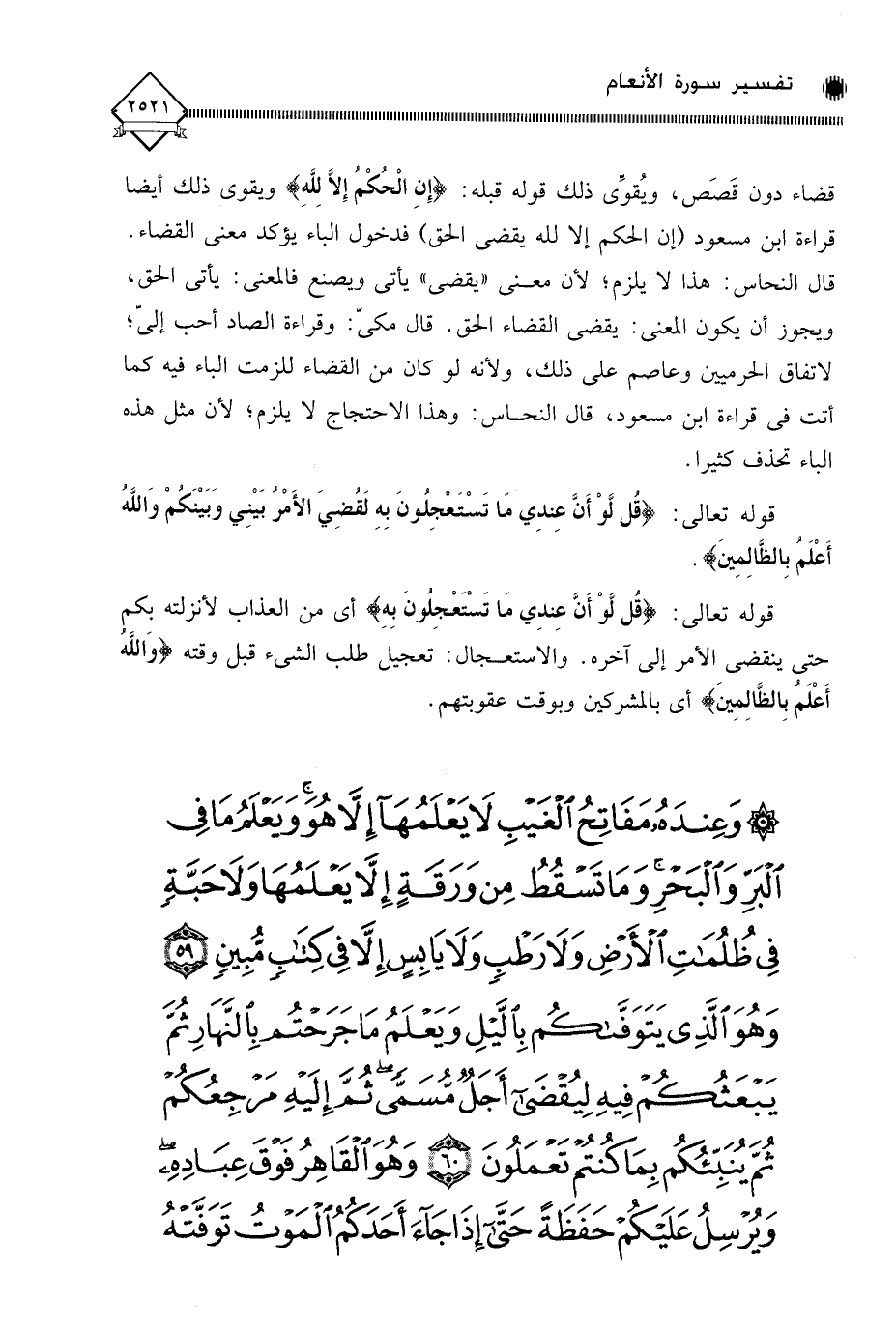 قال النحاس: هذا لَا يلزم، لأن معنى " يقضي " يأتي ويصنع فالمعنى: يأتي الحق، ويجوز أن يكون المعنى: يقضي القضاء الحق. قال مكيّ: وقراءة الصاد أحب إليّ؛ لاتفاق الحرميين وعاصم على ذلك، ولأنه لو كان من القضاء للزمت الباء فيه كما أتت في قراءة ابن مسعود، قال النحاس: وهذا الاحتجاج لَا يلزم؛ لأن مثل هذه الباء تحذف كثيرا.