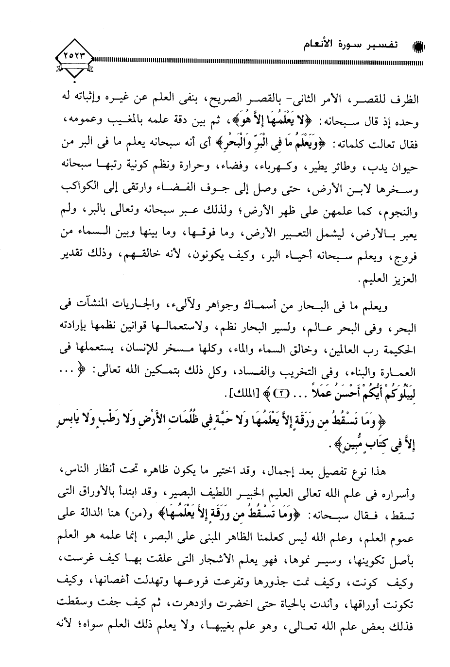 الظرف للقصر، الأمر الثاني - بالقصر الصريح، بنفي العلم عن غيره وإثباته له وحده إذ قال سبحانه: (لا يَعْلَمُهَا إِلَّا هُوَ)، ثم بين دقة علمه بالمغيب وعمومه، فقال تعالت كلماته: (وَيَعْلَمُ مَا فِى الْبَرِّ وَالْبَحْرِ) أي أنه سبحانه يعلم ما في البر من حيوان يدب، وطائر يطير، وكهرباء، وفضاء، وحرارة ونظم كونية رتبها سبحانه وسخرها لابن الأرض، حتى وصل إلى جوف الفضاء وارتقى إلى الكواكب والنجوم، كما علمهن على ظهر الأرض، ولذلك عبر سبحانه وتعالى بالبر، ولم يعبر بالأرض، ليشمل التعبير الأرض، وما فوقها، وما بينها وبين السماء من فروج، ويعلم سبحانه أحياء البر، وكيف يكونون، لأنه خالقهم، وذلك تقدير العزيز العليم.