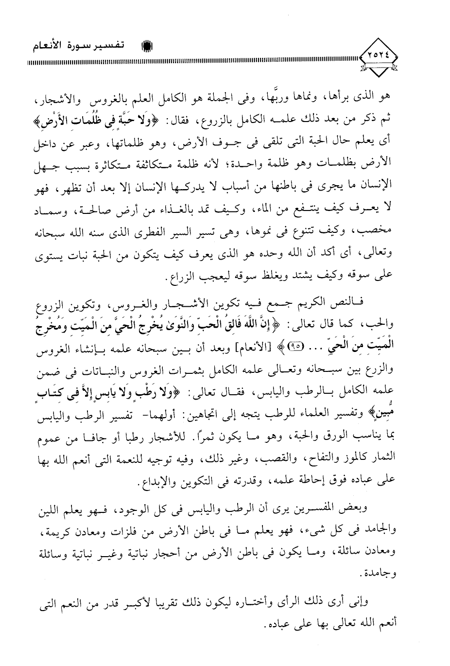 هو الذي برأها، ونماها وربَّها، وفي الجملة هو الكامل العلم بالغروس والأشجار، ثم ذكر من بعد ذلك علمه الكامل بالزروع، فقال: (وَلَا حَبَّةٍ فِي ظُلُمَاتِ الْأَرْضِ) أي يعلم حال الحبة التي تلقى في جوف الأرض، وهو ظلماتها، وعبر عن داخل الأرض بظلمات وهو ظلمة واحدة؛ لأنه ظلمة متكاثفة متكاثرة بسبب جهل الإنسان ما يجري في باطنها من أسباب لَا يدركها الإنسان إلا بعد أن تظهر، فهو لا يعرف كيف ينتفع من الماء، وكيف تمد بالغذاء من أرض صالحة، وسماد مخصب، وكيف تتنوع في نموها، وهي تسير السير الفطري الذي سنه الله سبحانه وتعالى، أي أكد أن الله وحده هو الذي يعرف كيف يتكون من الحبة نبات يستوي على سوقه وكيف يشتد ويغلظ سوقه ليعجب الزراع.