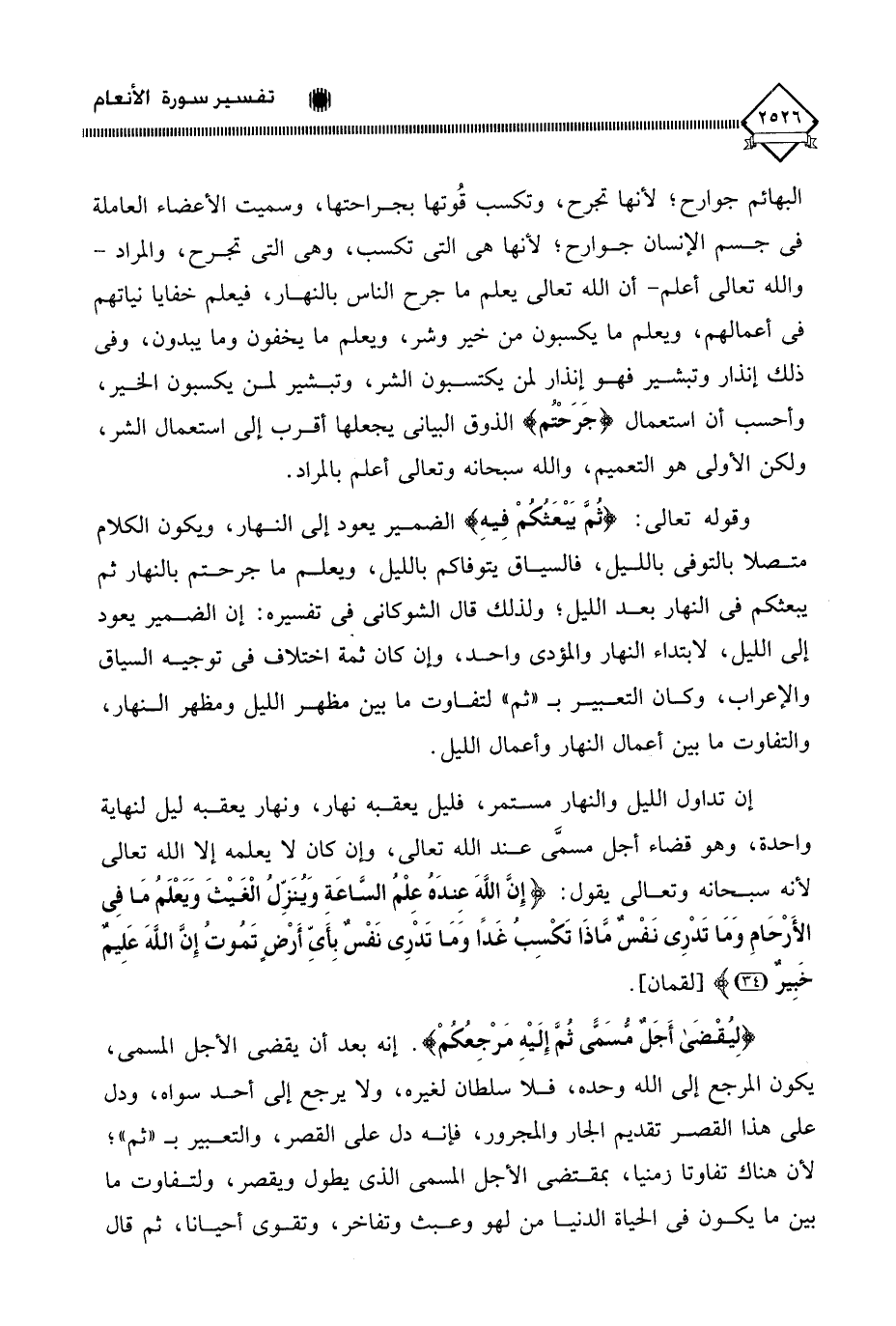 وقوله تعالى: (ثُمَّ يَيْعَثُكُمْ فِيهِ) الضمير يعود إلى النهار، ويكون الكلام متصلا بالتوفي بالليل، فالسياق يتوفاكم بالليل، ويعلم ما جرحتم بالنهار ثم يبعثكم في النهار بعد الليل، ولذلك قال الشوكاني في تفسيره: إن الضمير يعود إلى الليل، لابتداء النهار والمؤدى واحد، وإن كان ثمة اختلاف في توجيه السياق والإعراب، وكان التعبير بـ " ثم " لتفاوت ما بين مظهر الليل ومظهر النهار، والتفاوت ما بين أعمال النهار وأعمال الليل.