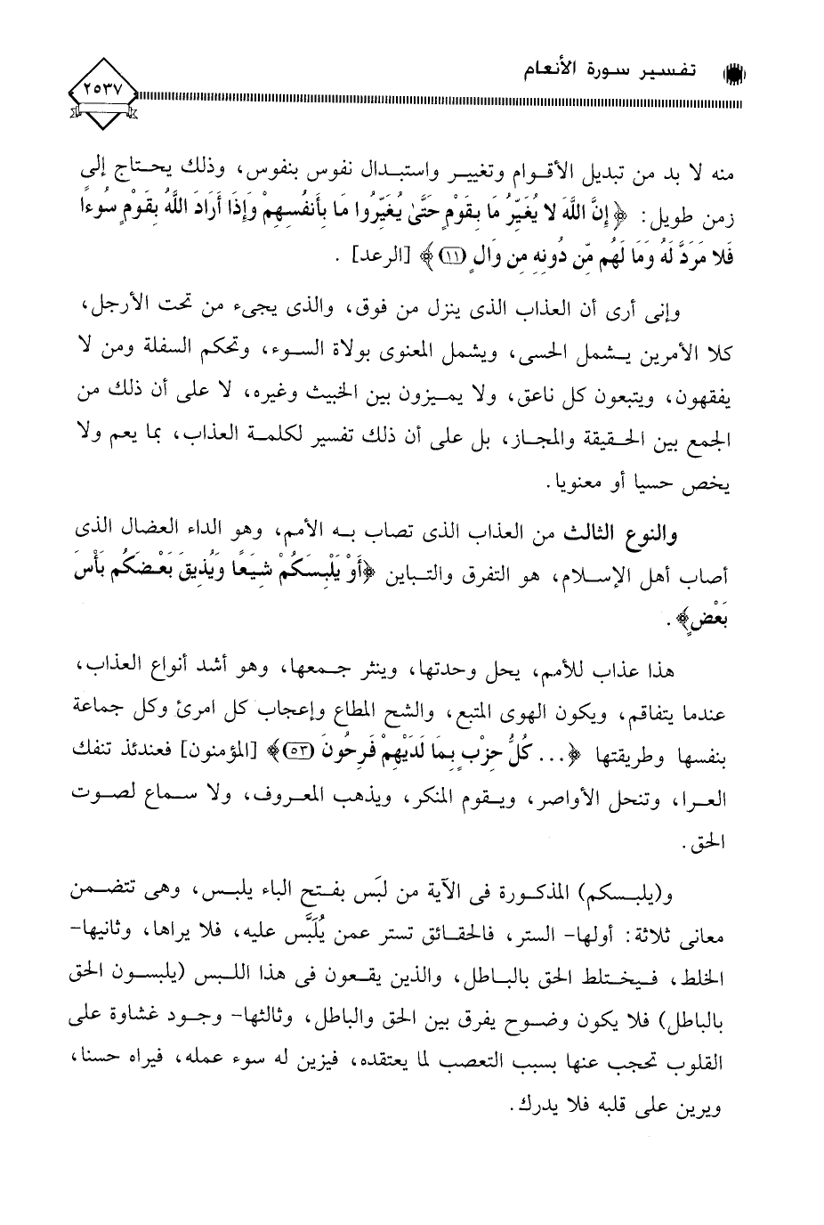 هذا عذاب للأمم، يحل وحدتها، وينثر جمعها، وهو أشد أنواع العذاب، عندما يتفاقم، ويكون الهوى المتبع، والشح المطاع وإعجاب كل امرئٍ وكل جماعة بنفسها وطريقتها (. . . كُلُّ حِزْبٍ بِمَا لَدَيْهِمْ فَرِحونَ)، فعندئذ تنفك العرا، وتنحل الأواصر، ويقوم المنكر، ويذهب المعروف، ولا سماع لصوت الحق.