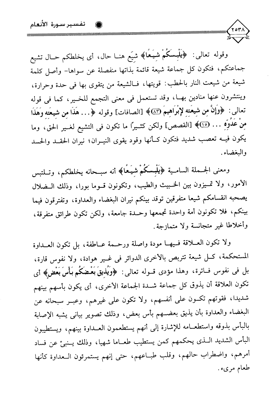 وقوله تعالى: (يَلْبِسَكُمْ شِيَعًا) شيَع هنا حال، أي يخلطكم حال تشيع جماعتكم، فتكون كل جماعة شيعة قائمة بذاتها منفصلة عن سواها - وأصل كلمة شيعة من شيعت النار بالحطب: قويتها، فالشيعة من يتقوى بها في حدة وحرارة، وينتشرون عنها منادين بها، وقد تستعمل في معنى التجمع للخير، كما في قوله تعالى: (وَإِنَّ مِن شيعَتِهِ لإِبْرَاهِيمَ)، وقوله (. . . هَذَا مِن شِيعَتِهِ وَهَذَا مِنْ عَدُوِّهِ. . .)، ولكن كثيرًا ما تكون في التشيع لغير الحق، وما يكون فيه تعصب شديد فتكون كأنها وقود يقوي النيران؛ نيران الحقد والحسد والبغضاء.