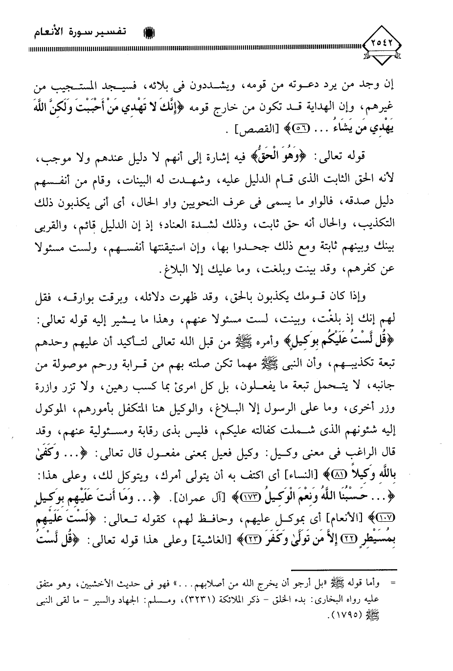 وإذا كان قومك يكذبون بالحق، وقد ظهرت دلائله، وبرقت بوارقه، فقل لهم إنك إذ بلغْت، وبينت، لست مسئولا عنهم، وهذا ما يشير إليه قوله تعالى: (قُل لَّسْتُ عَلَيْكُم بِوَكِيل) وأمره - صلى الله عليه وسلم - من قبل الله تعالى لتأكيد أن عليهم وحدهم تبعة تكذيبهم، وأن النبي - صلى الله عليه وسلم - مهما تكن صلته بهم من قرابة ورحم موصولة من جانبه، لَا يتحمل تبعة ما يفعلون، بل كل امرئٍ بما كسب رهين، ولا تزر وازرة وزر أخرى، وما على الرسول إلا البلاغ، والوكيل هنا المتكفل بأمورهم، الموكول إليه شئونهم الذي شملت كفالته عليكم، فليس بذي رقابة ومسئولية عنهم، وقد قال الراغب في معنى وكيل: وكيل فعيل بمعنى مفعول قال تعالى: (. . . وَكفَى بِاللَّهِ وَكِيلًا)، أي اكتف به أن يتولى أمرك، ويتوكل لك، وعلى هذا: (. . . حَسْبُنَا اللَّهُ وَنِعْمَ الْوَكيلُ). (. . . وَمَا أَنتَ عَلَيْهِم بِوَكيلٍ)، أي بموكل عليهم، وحافظ لهم، كقوله تعالى: (لَسْتَ عَلَيْهِمْ بِمُصَيْطِرٍ (22) إِلَّا مَنْ تَوَلَّى وَكَفَرَ (23). وعلى هذا قوله تعالى: (قُل لَّسْتُ