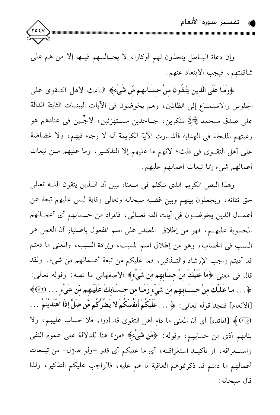 فنجد قوله تعالى: (. . . عَلَيْكُمْ أَنفُسَكُمْ لَا يَضُرُّكُم مَّن ضَلَّ إِذَا اهْتَدَيْتُمْ. . .)، أي أن المعنى ما دام أهل التقوى قد أدوا، فلا حساب عليهم، ولا ينالهم أذى من حسابهم، وقوله: (مِن شَيْءٍ) " من " هنا للدلالة على عموم النفي واستغراقه، أو تأكيد استغراقه، أي ما عليكم أي قدر - ولو ضؤل - من تبعات أعمالهم ما دمتم قد ذكرتموهم العاقبة لما هم عليه، فالواجب عليكم التذكير، ولذا قال سبحانه: