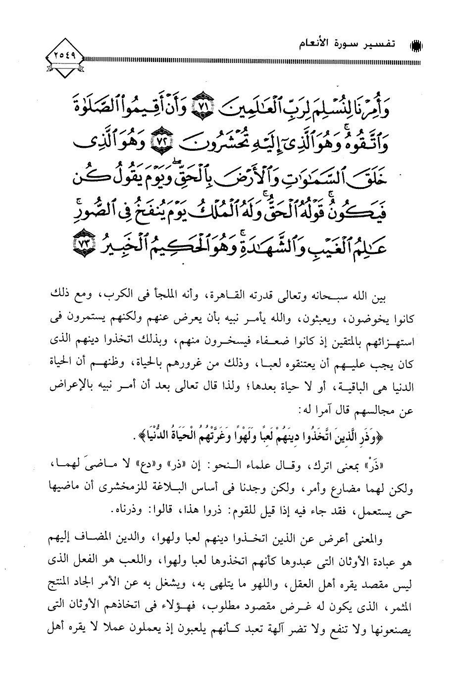 وَأُمِرْنَا لِنُسْلِمَ لِرَبِّ الْعَالَمِينَ (71) وَأَنْ أَقِيمُوا الصَّلَاةَ وَاتَّقُوهُ وَهُوَ الَّذِي إِلَيْهِ تُحْشَرُونَ (72) وَهُوَ الَّذِي خَلَقَ السَّمَاوَاتِ وَالْأَرْضَ بِالْحَقِّ وَيَوْمَ يَقُولُ كُنْ فَيَكُونُ قَوْلُهُ الْحَقُّ وَلَهُ الْمُلْكُ يَوْمَ يُنْفَخُ فِي الصُّورِ عَالِمُ الْغَيْبِ وَالشَّهَادَةِ وَهُوَ الْحَكِيمُ الْخَبِيرُ (73)